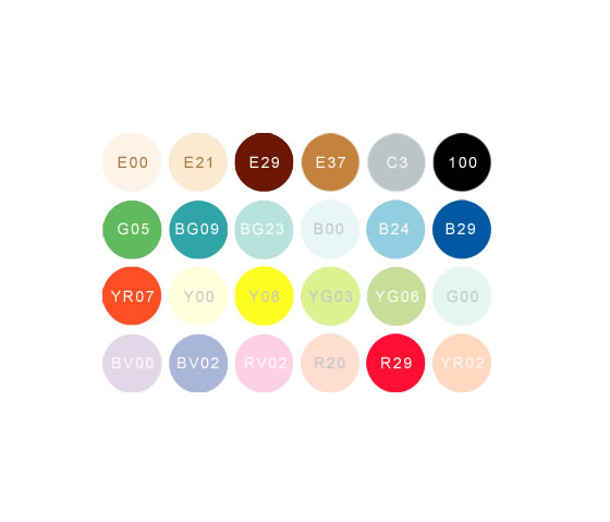 Набор состоит из оттенков: E00, E21, E29, E37, C-3, 100, G05, BG09, BG23, B00,B24, B29, YR07, Y00, Y08, YG03, YG06, G00, BV00, BV02, RV02, R20, R29, YR02 и поставляется в удобном пластиковом боксе.