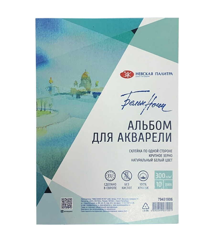 Склейка для акварели, 130*190 мм, 300г/м2 ,10л, 100% хлопок, крупное зерно
