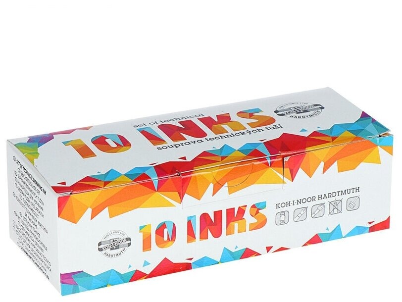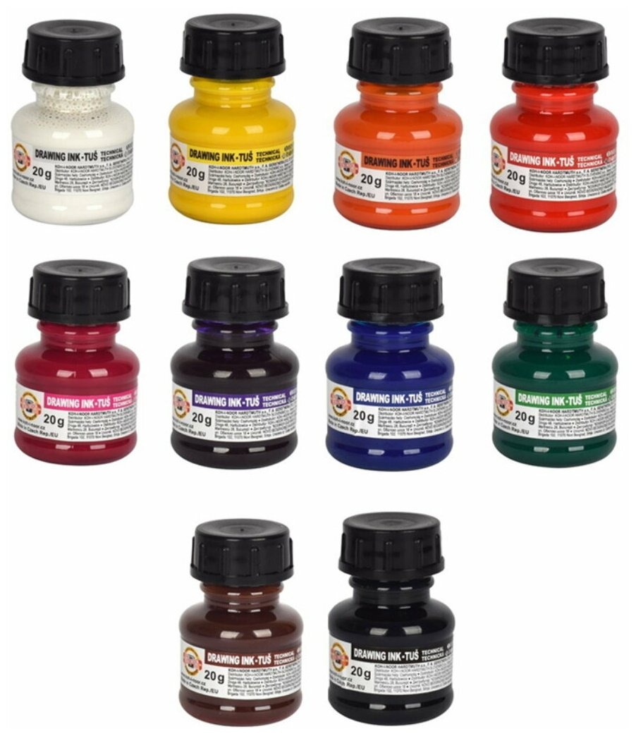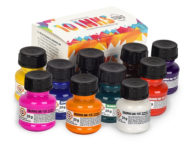 Тушь для рисования Koh-i-noor drawing ink. Тушь произведены на водной основе и подходит для нанесения с помощью кисточки или пера-макалки. Тушь после высыхания становится устойчива к воде и позволяет работать в смешанных техниках. Тушь разлита в небольшие пластиковые бутылочки объемом 20 мл.