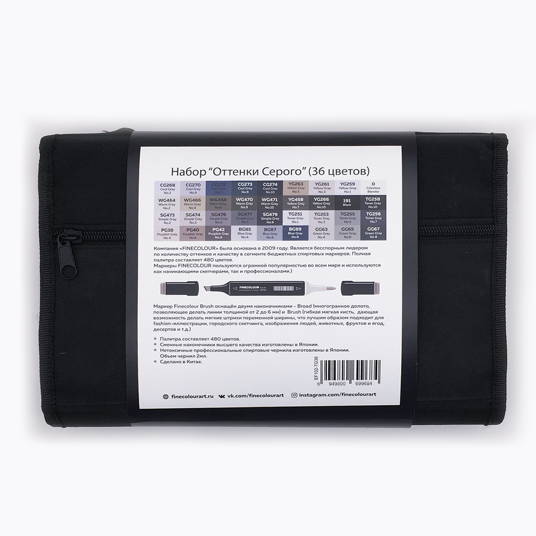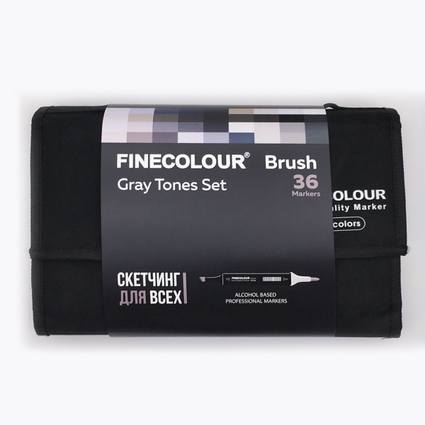 Набор спиртовых маркеров для скетчей Finecolour "Brush" в пенале 36 цветов, Оттенки серого