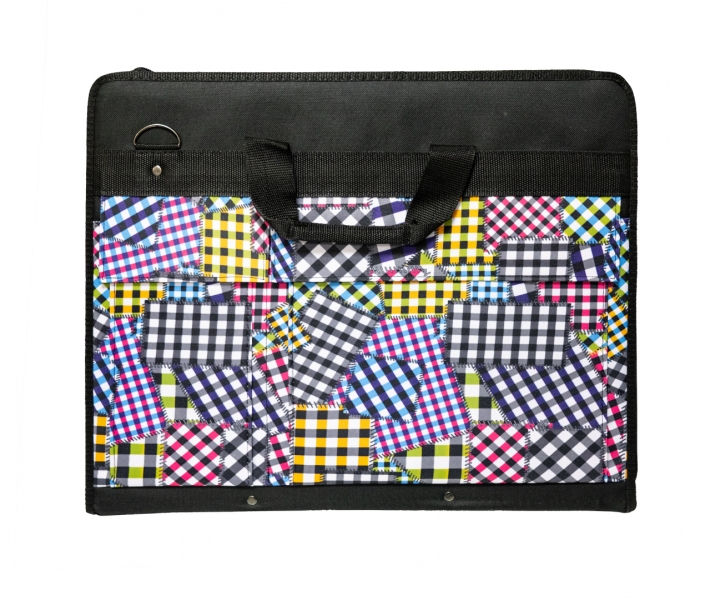Папка "Художник" цвет "Пэчворк" (49*38.5*6см) Внутри папки съемная двойная перегородка. На внешней стороне два объемных кармана с клапаном, узкий 15*31 (под кисти) и широкий 49*31(формат А4). Снабжена ручками и регулируемым ремнем для переноски на плече.