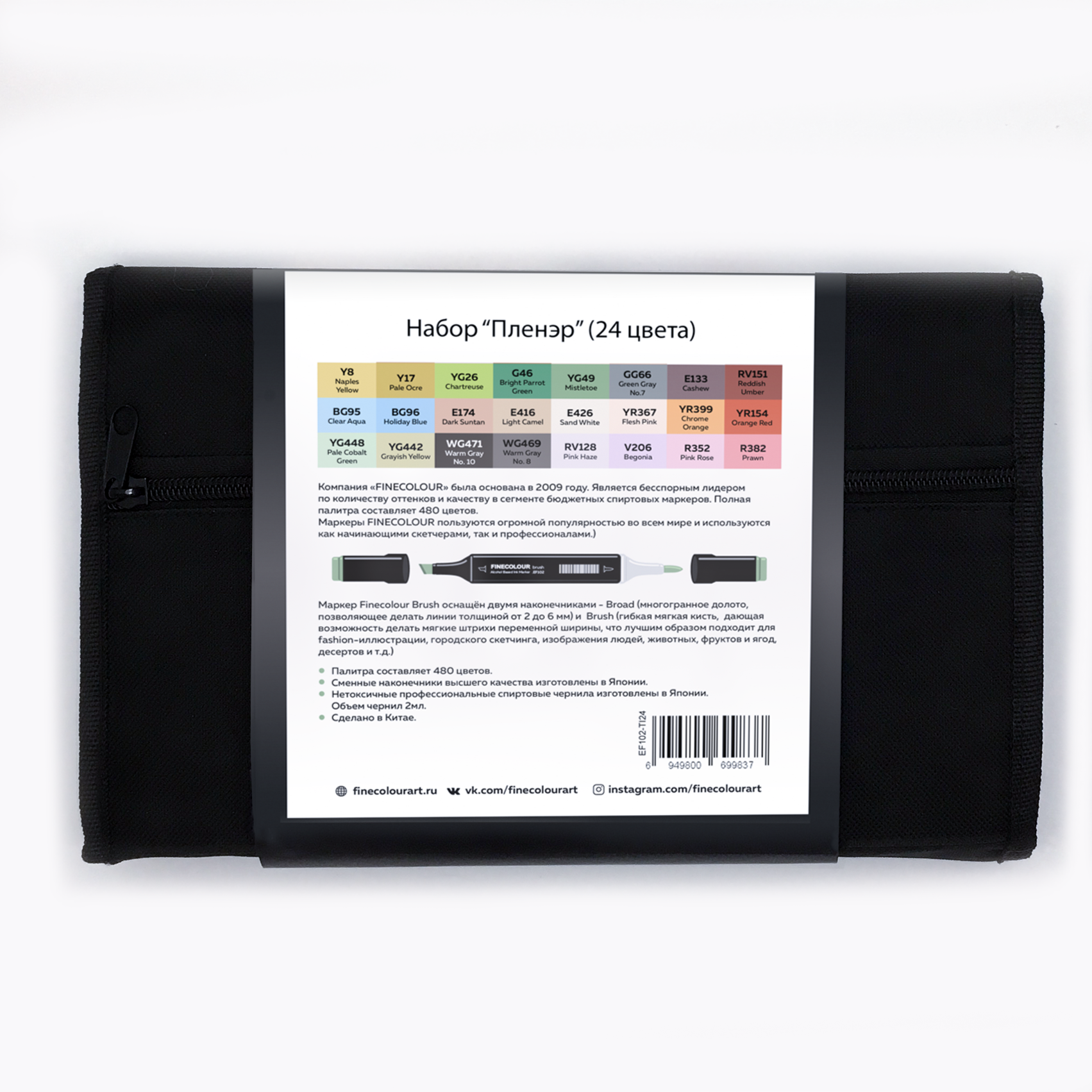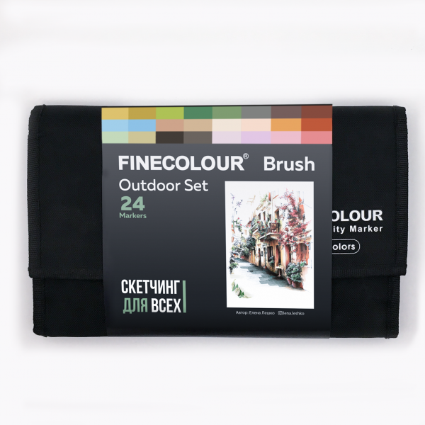 Тематический набор маркеров FINECOLOUR BRUSH 24 цвета для скетчинга. Иллюстрация для обложки была нарисована художницей Лена Лешко. Цветовая палитра поможет вам при зарисовках зданий, улочек, тёплых солнечных теней, цветов и зелени. Двухсторонние перезаправляемые спиртовые маркеры с японскими наконечниками высшего качества браш (гибкий, мягкий, иммитация кисти) и долото (широкий, твердый, толщина линии от 2 до 6 мл). Отличные показатели герметизации, благодаря чему наполнение внутри маркеров FINECOLOUR не сохнет. Колпачок открывается скручиванием, после использования должен быть плотно закрыт. Номер цвета указан на крышке каждого маркера с обеих сторон.