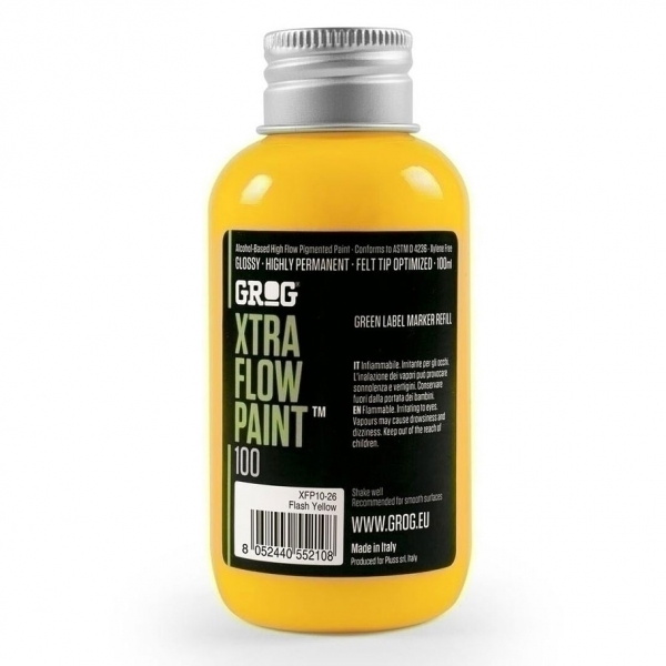 Краска-заправка перманентная GROG XTRA FLOW PAINT 100 мл на спиртовой основе. Глянцевая, укрывистая, хорошо растекается. Подходит для наружных и внутренних работ, рекомендуется использовать на гладких поверхностях, можно заправлять пустые маркеры-каттеры или использовать, как самостоятельный продукт. Чернила не содержит ксилола в соответствии со стандартом ASTM D 4236. В линейке: 16 цветов. Бутылки сделаны из ударопрочного пластика.