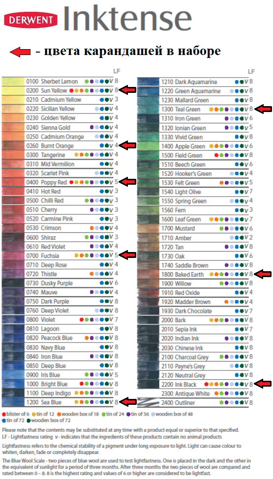 В наборе: 8 карандашей Derwent Inktense, распылитель, кисть с резервуаром для воды, кисть. Акварельные карандаши Derwent Inktense с эффектом чернил. Эффект достигается размыванием. В отличие от классических акварельных карандашей после высыхания размытого рисунка, сделанного карандашами или блоками Derwent Inktense, повторно размыть работу не получится. После высыхания рисунок становится устойчивым к стиранию и воде, что позволяет использовать карандаши для росписи тканей, например, шелка или хлопкаю На круглом корпусе карандаша указан номер и название цвета, также каждый карандаш имеет визуальное обозначение цвета (задняя часть корпуса карандаша окрашена в соответствии с цветом). Можно использовать как обычные цветные карандаши. Цвета в наборе: Sun Yellow, Burnt Orange, Poppy Red, Fuchsia, Sea Blue, Teal Blue, Baked Earth, Ink Black