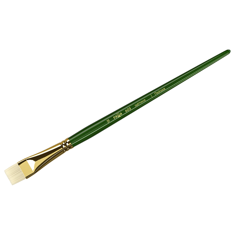 Кисти серии «Пейзаж» изготавливаются из отбеленной и очищенной специальными химическими реагентами щетины. Кисть даже после продолжительного использования не теряет свою форму. В пучке преобладают волоски с расщепленным кончиком, поэтому кисть хорошо наполняется краской и хорошо отдает краску. Упругий и прочный свиной волос отлично подходит для работы с тяжелыми масляными и акриловыми красками. Щетина износоустойчива к сильным растворителям. Длинная ручка кисти покрыта глянцевым лаком изумрудного цвета.