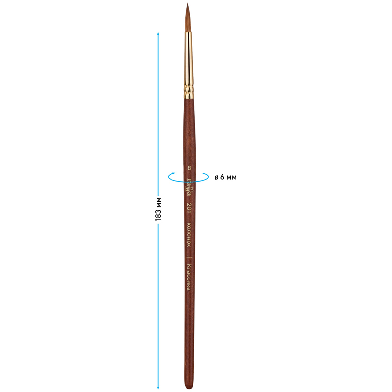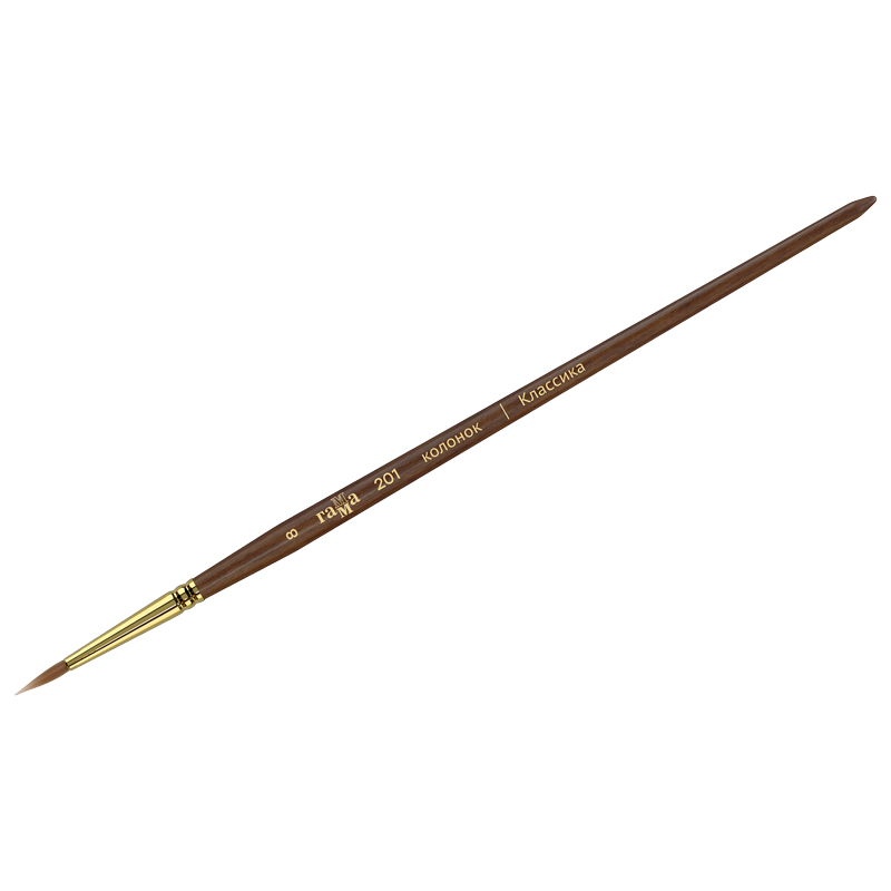 Кисти изготовлены из натурального ворса колонка. Кисть предназначена для работы с акварельными, гуашевыми и акриловыми красками. В масляной живописи колонок используют для нанесения гладких, ровных и точных мазков.Волос колонка обладает уникальными свойствами - он одновременно длинный, упругий, эластичный и прочный. Благодаря большей, чем у белки, упругости, кисть позволяет лучше контролировать мазок. Кисть вяжут из волосков разной длины, что позволяет при соприкосновении наполненной кисти с поверхностью создать капиллярный поток краски. Важно проводить своевременный и правильный уход за кистью: необходимо очищать кисти от краски до того как она засохнет, и тогда они прослужат долгое время. Деревянная ручка из древесины березы покрыта матовым лаком.