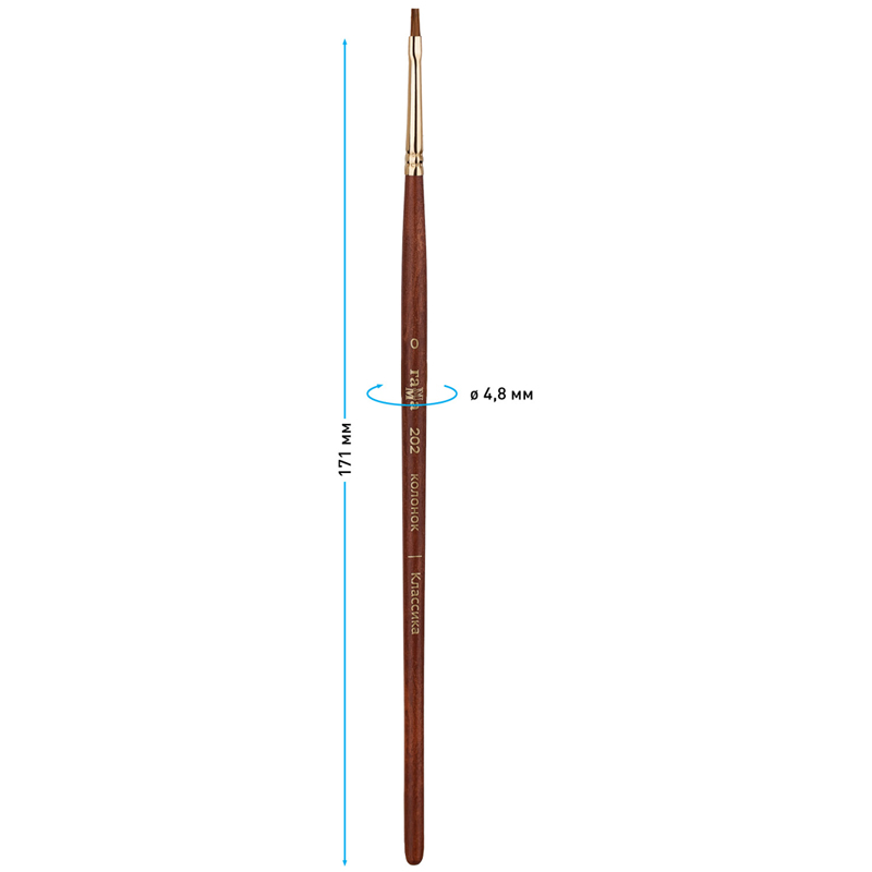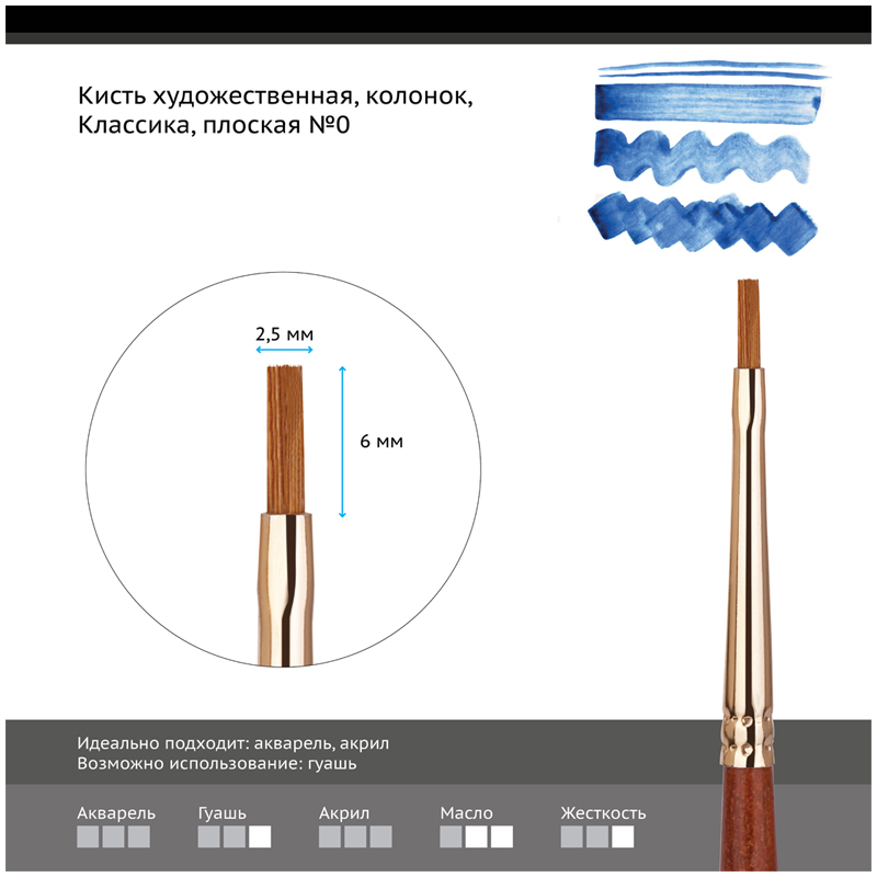 Кисти изготовлены из натурального ворса колонка. Кисть предназначена для работы с акварельными, гуашевыми и акриловыми красками. В масляной живописи колонок используют для нанесения гладких, ровных и точных мазков.Волос колонка обладает уникальными свойствами - он одновременно длинный, упругий, эластичный и прочный. Благодаря большей, чем у белки, упругости, кисть позволяет лучше контролировать мазок. Кисть вяжут из волосков разной длины, что позволяет при соприкосновении наполненной кисти с поверхностью создать капиллярный поток краски. Важно проводить своевременный и правильный уход за кистью: необходимо очищать кисти от краски до того как она засохнет, и тогда они прослужат долгое время. Деревянная ручка из древесины березы покрыта матовым лаком.