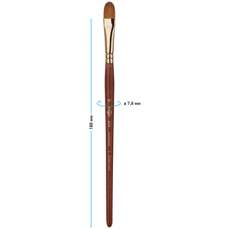 Кисти изготовлены из натурального ворса колонка. Кисть предназначена для работы с акварельными, гуашевыми и акриловыми красками. В масляной живописи колонок используют для нанесения гладких, ровных и точных мазков.Волос колонка обладает уникальными свойствами - он одновременно длинный, упругий, эластичный и прочный. Благодаря большей, чем у белки, упругости, кисть позволяет лучше контролировать мазок. Кисть вяжут из волосков разной длины, что позволяет при соприкосновении наполненной кисти с поверхностью создать капиллярный поток краски. Важно проводить своевременный и правильный уход за кистью: необходимо очищать кисти от краски до того как она засохнет, и тогда они прослужат долгое время. Деревянная ручка из древесины березы покрыта матовым лаком.