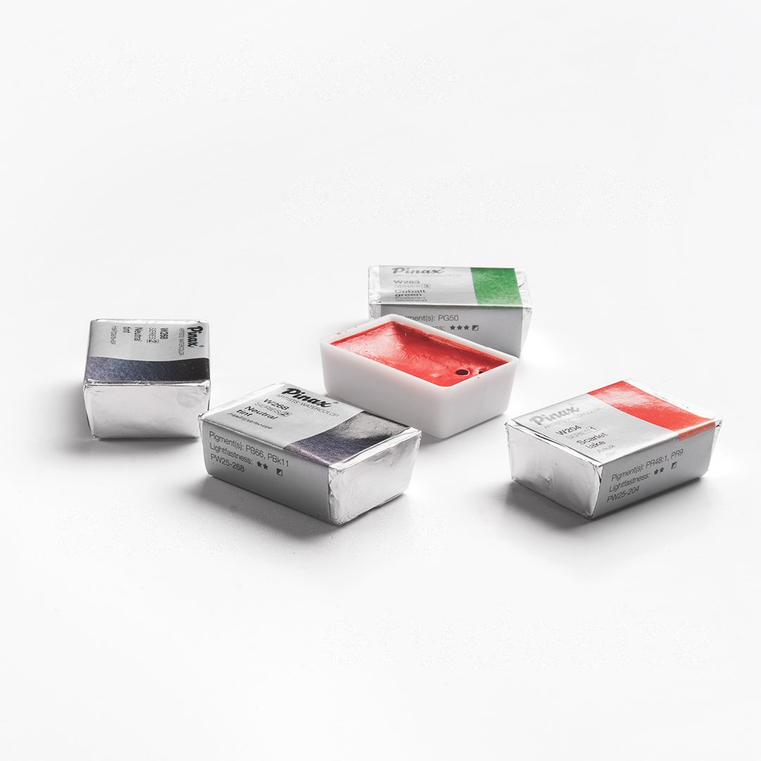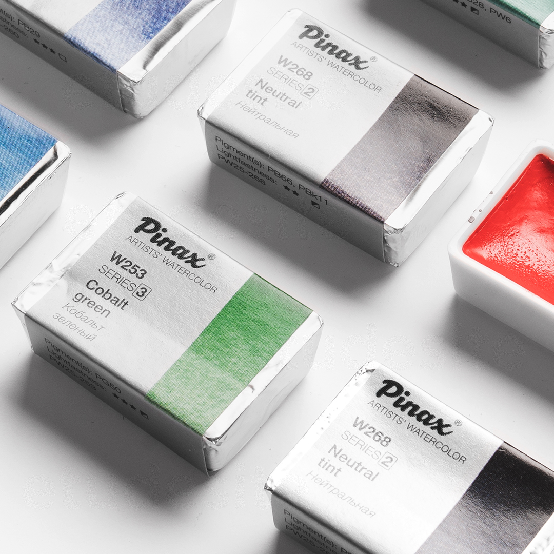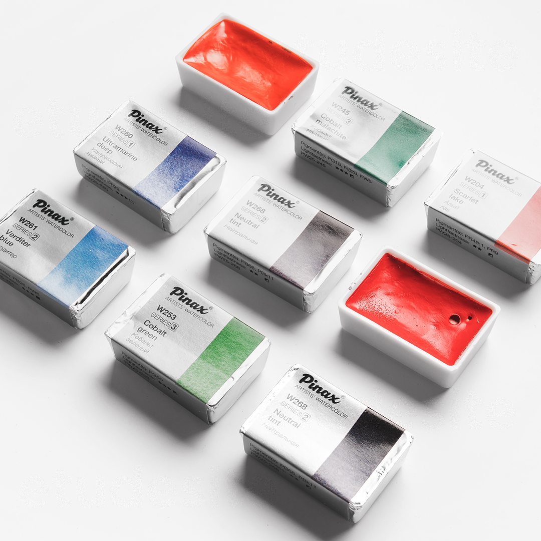 Художественная акварель Pinax – это профессиональные краски наивысшего качества, производимые в Корее по классической технологии на основе лучших пигментов и натурального высококачественного гуммиарабика, используемого как связующее. Благодаря концентрированному содержанию пигмента и высокой степени перетира, цвета отличаются прозрачностью, имеют одинаковую пастообразную текстуру, характеризуются чистотой и насыщенностью цвета, отличной светостойкостью. Краски прекрасно смешиваются и идеально подходят для всех акварельных техник. Цветовая палитра состоит из 71 цвета, от полностью прозрачных до укрывистых цветов, включая краски на основе кадмиевых и кобальтовых пигментов.