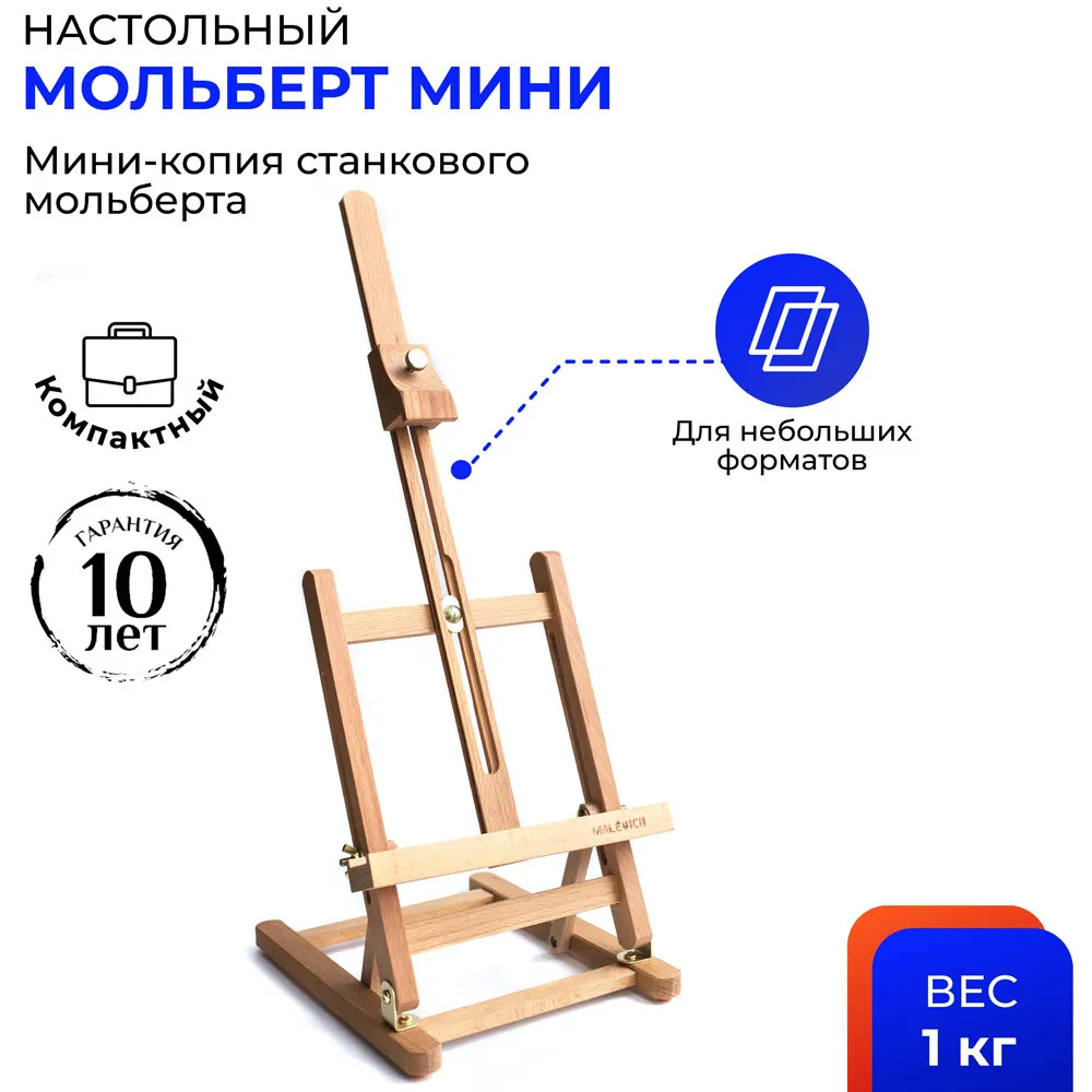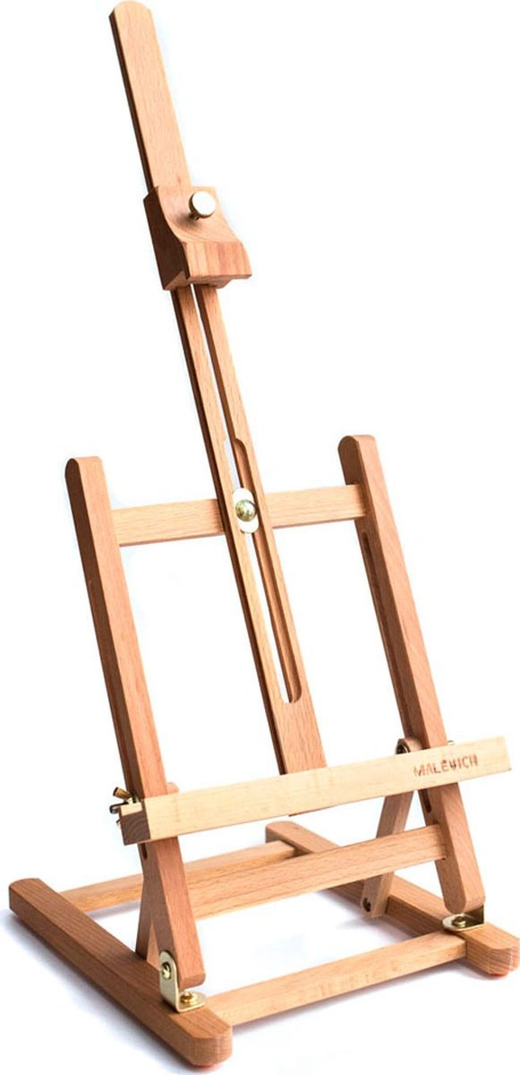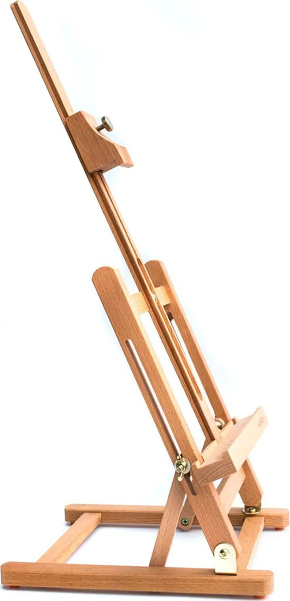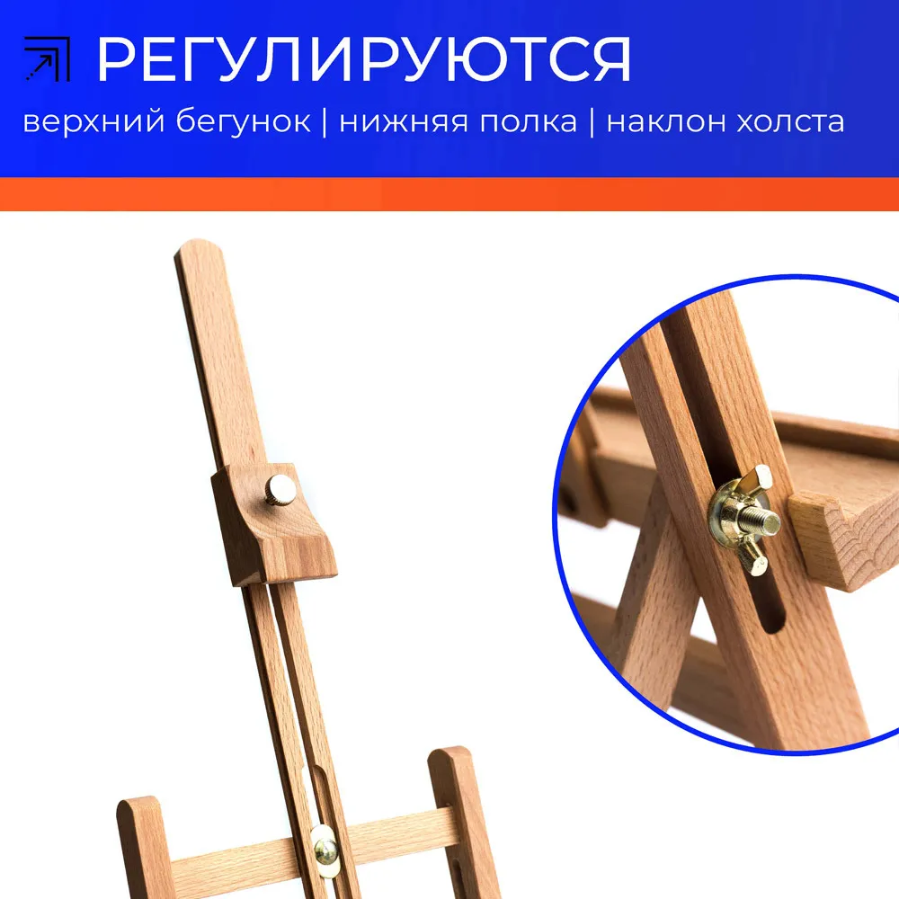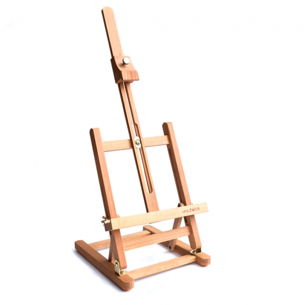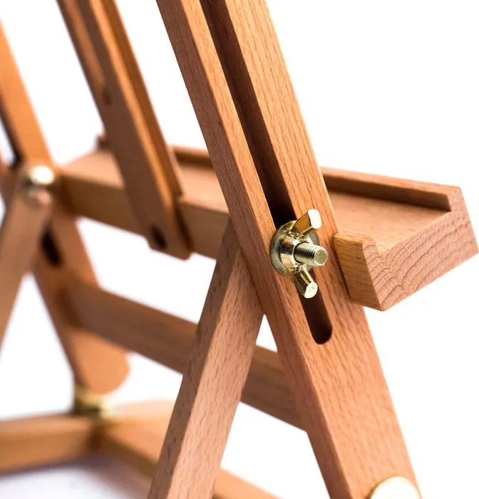 Миниатюрный настольный мольберт предназначен для работы не небольших форматах. Нижняя полка и верхний бегунок регулируются по высоте. Наклон холста также можно изменять.