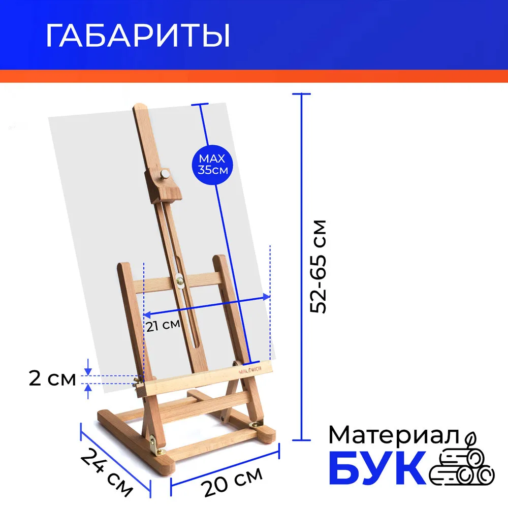Ширина основания 20 см, глубина 24 см. Ширина полки 21 см, глубина 2 см. Высота от 54 до 65 см. Глубина верхнего бегунка 2,3 см. Максимальная высота холста 40 см. Вес 1 кг.