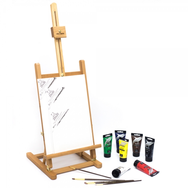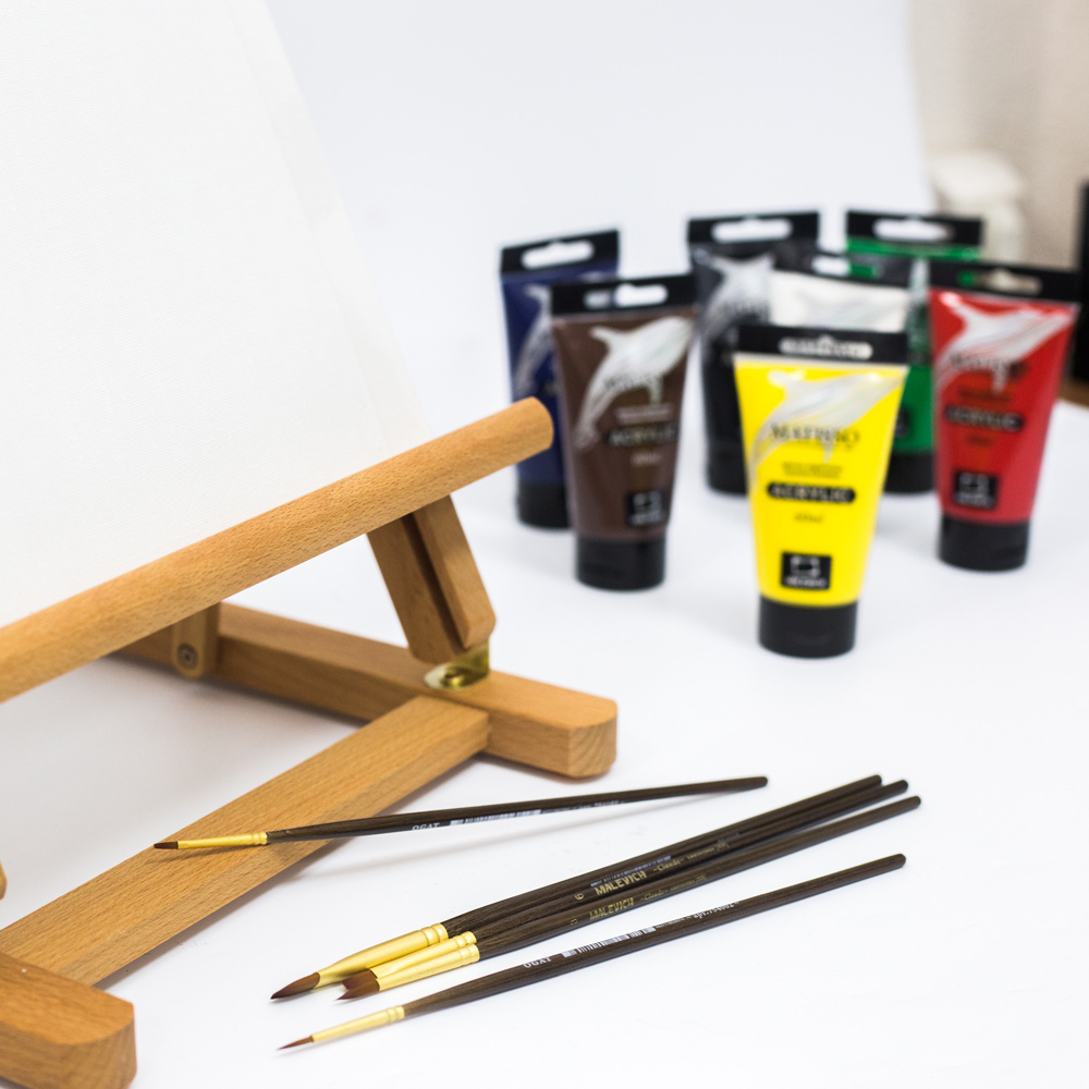 Настольный мольберт МЛ-57. Холст на картоне Малевичъ 20x20, 20х30 25х35 см. Кисть из синтетики "Claude" круглая №2, 3. Кисти из синтетики "Claude" плоские №3, 6, 10. Акриловая краска Малевичъ Matisso (7 туб по 60 мл): Белила Титановые, желтый светлый или лимонный, красный или алый, голубая "фц" или ультрамарин, зеленый средний или берлинская зелень, марс коричневый или умбра жженая, черная.