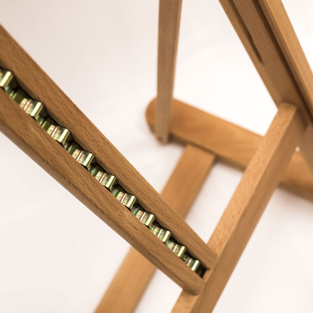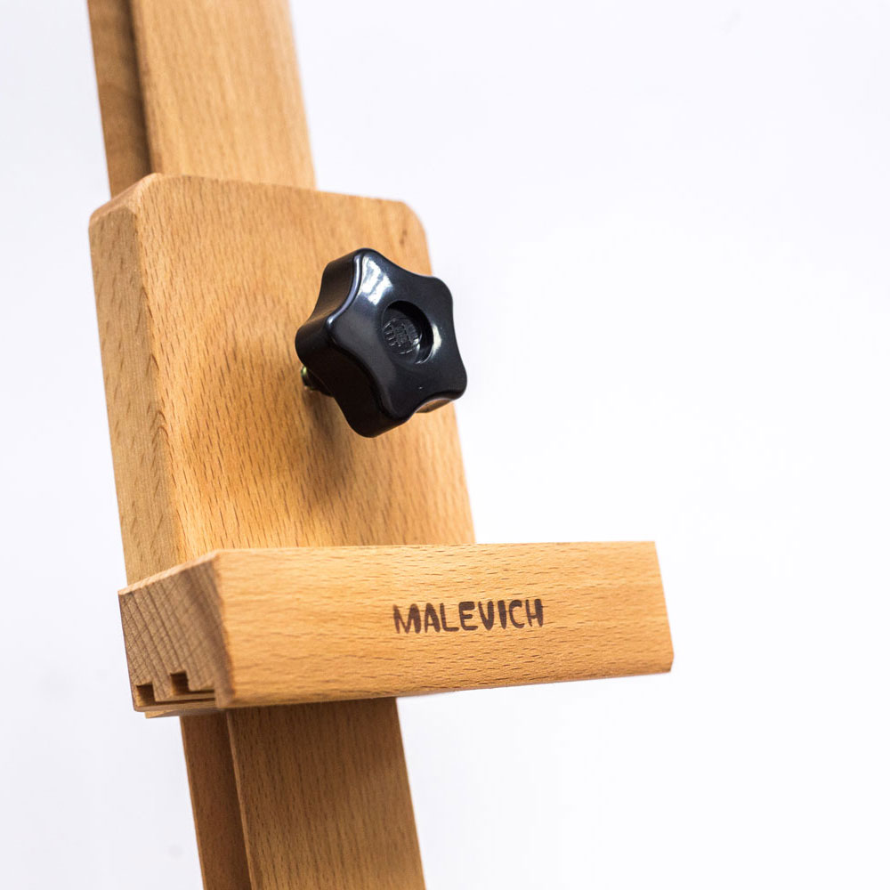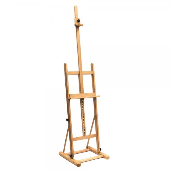Этот стационарный мольберт отлично подойдет для работы на больших холстах и иконных досках. Оснащен полкой для кистей и красок, которая свободно двигается вверх-вниз с помощью специального механизма. Мольберт можно наклонять на себя и от себя, при этом плоское основание обеспечивает мольберту хорошую устойчивость. Выполнен из бука. Высота от 171 до 236 см. Ширина полки 54 см, глубина 5,5 см. Глубина верхнего бегунка 4,5 см. Ширина основания 54 см, глубина 55 см. Максимальная высота холста 123 см. Вес 9 кг.