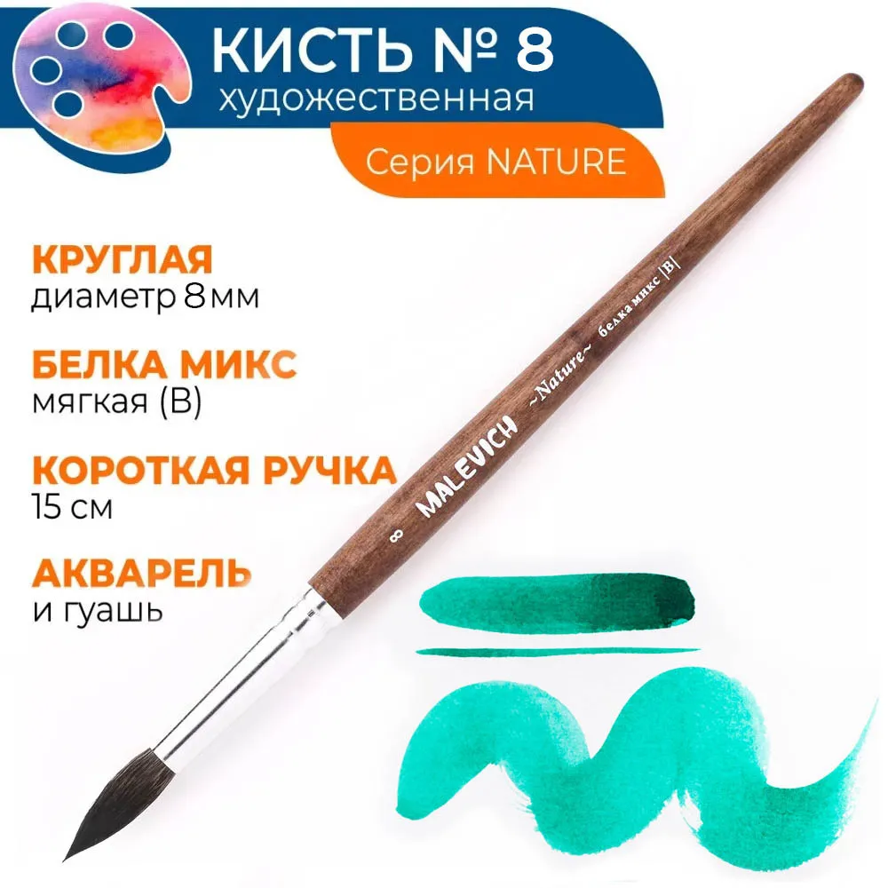 Серия кистей из белки микс Nature сочетает высококачественный ворс из хвоста сибирской белки и мягкую синтетику. За счет сочетания материалов кисть становится более управляемой и долговечной, чем кисти из 100% беличьего ворса. Латунная обойма с антикоррозийным покрытием и двойным обжимом. Березовая ручка от 14 до 17 см (в зависимости от размера) покрыта коричневой морилкой и матовым лаком. Произведено в России.