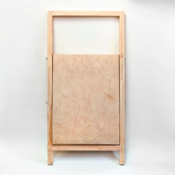 Натюрмотный столик с регулируемой по высоте столешницей выполнен из сосны и березовой фанеры. Полка регулируется от 50 до 95 см. от пола. В собранном виде занимает мало места. Высота горизонтальной полки регулируется от 50 до 95 см. Размер столешницы 60х80 см. Габариты в рабочем положении: Ширина 69,5 см, Высота 130 см, Глубина 90 см.