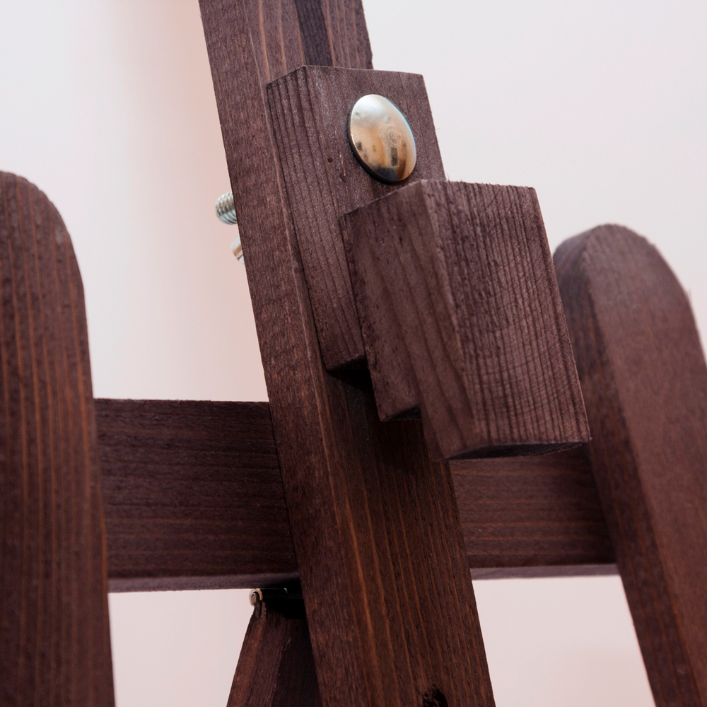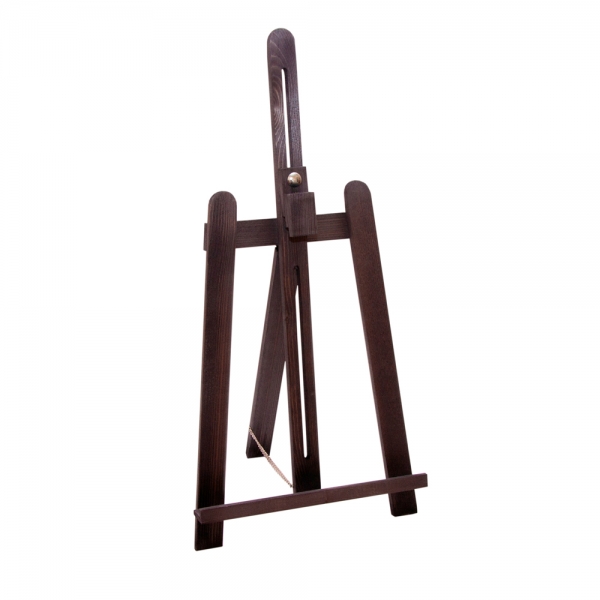 Небольшой настольный мольберт для работ на формате А3 и меньше. Верхний зажим можно переставить вниз для работы на маленьких холстах. Для рисования на бумаге дополнительно необходим планшет. Высота 55 см, ширина 26 см. Покрыт морилкой шоколадного цвета.Ширина 26 см, Глубина 25 см. Высота 55 см.