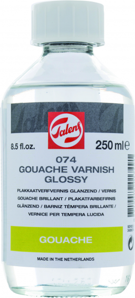 Финишный лак для гуаши. Состав: бесцветная синтетическая смола, уайт-спирит. Высыхает в течение нескольких часов, после высыхания работа менее восприимчива к воздействию влаги. Увеличивает блеск красок, для уменьшения блеска можно смешать с матовым лаком для гуаши. Делает цвета темнее и прозрачнее. Не желтеет. Удаляется и разбавляется уайт-спиритом.