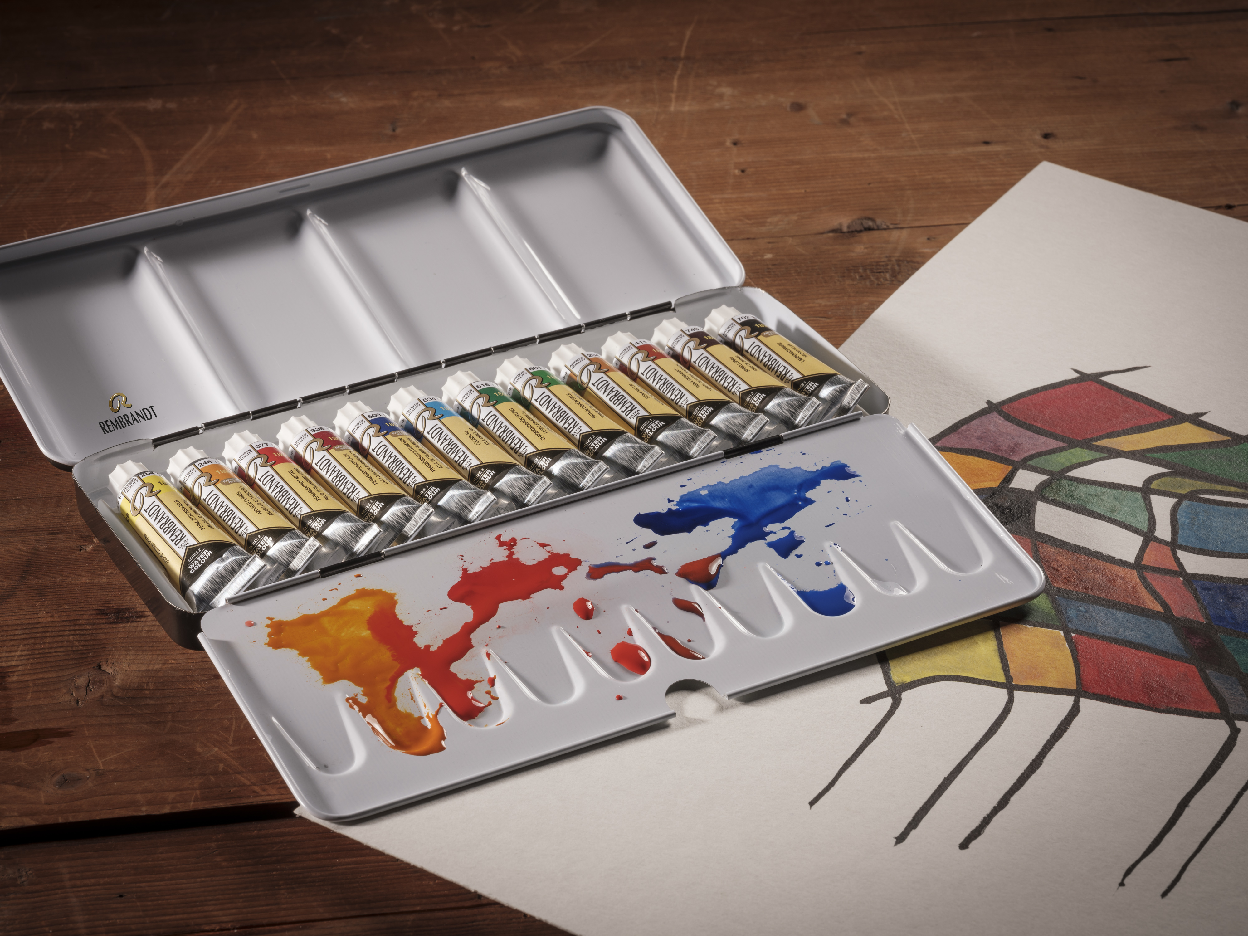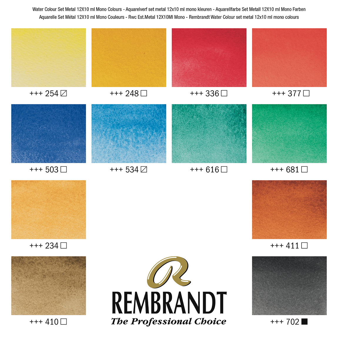 В наборе 12 туб по 10мл, цвета: 254-234-248-336-377-4100-411-503-534-616-681-702 + сборная кисть серия 110 №6 (круглая из соболя). Акварель Royal Talens Rembrandt произведена из гуммиарабика и пигментов без наполнителей. Технология производства неизменна с 1899 года. Благодаря высокой насыщенности пигментами и превосходной светостойкости, акварели Rembrandt отдают предпочтение многие художники-акварелисты во всём мире. Светостойкость большинства цветов более 100 лет (при музейных условиях хранения).