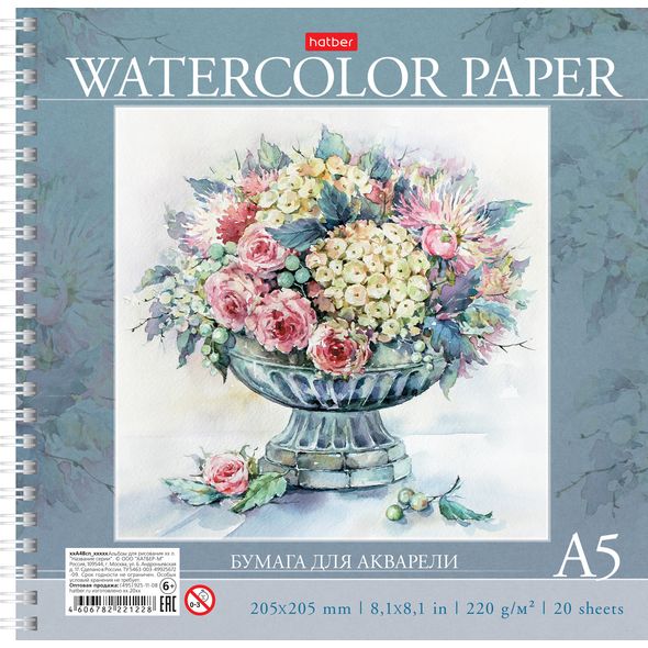 Альбом для акварели А5 формата (205х205мм), на гребне.Внутренний блок-20 листов, 220 гр., отличается качеством и плотностью бумаги. Жесткая подложка позволит делать зарисовки на весу.Обложка изготовлена из высококачественного мелованного картона и дополнена спецэффектом в виде тиснения. Альбом для акварели ТМ Hatber российского производства отпечатан на современном высокотехнологичном оборудовании и соответствует стандартам качества. Подходит для рисования акварельными красками, акварельными карандашами, гуашью и фломастерами. Рисование в альбомах Hatber-это увлекательный и творческий досуг для всех.