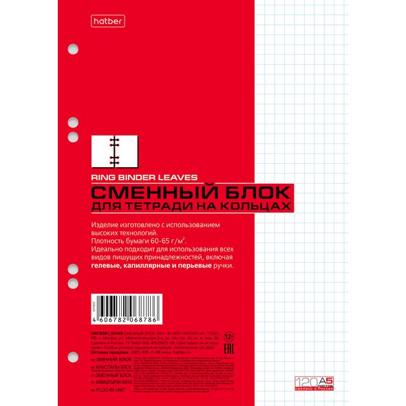 Сменный блок для тетрадей на кольцах А5 формата. Количество листов: 120.Блок: офсет 60 гр., клетка, универсальная перфорация на 6 отверстий. Упаковка: индивидуальная в термоусадочную пленку.Предназначен для тетрадей и папок на кольцах. Подходит для использования всех видов пишущих принадлежностей, включая гелевые, капиллярные и перьевые ручки.