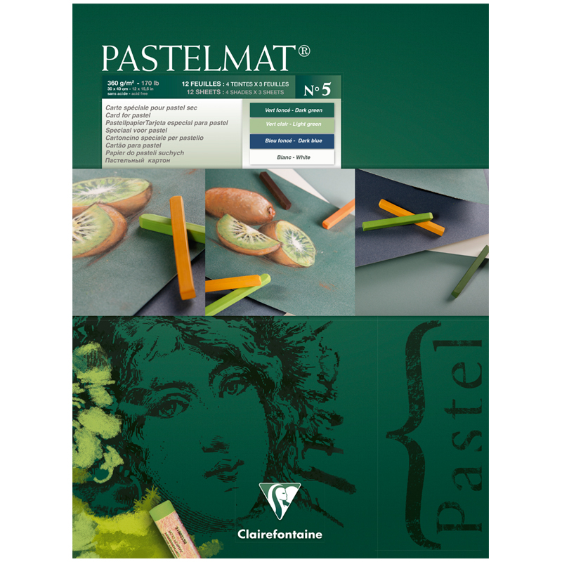 Альбом для пастели " Pastelmat " - это альбом с уникальной бумагой плотностью 360 г/м2. Текстура бумаги похожа на шероховатый бархат – более грубая в отличие от велюра, но более мягкая, чем песок. Благодаря всем этим свойствам, пастель хорошо ложится на бумагу без дополнительной фиксации. Пастель можно наслаивать, что не скажется на качестве и структуре бумаги и рисунка в целом. Каждый лист в альбоме разделен пергаментной бумагой. В альбоме 12 листов, четырехцветный блок: тёмно-зелёный, светло-зелёный, тёмно-синий, белый.