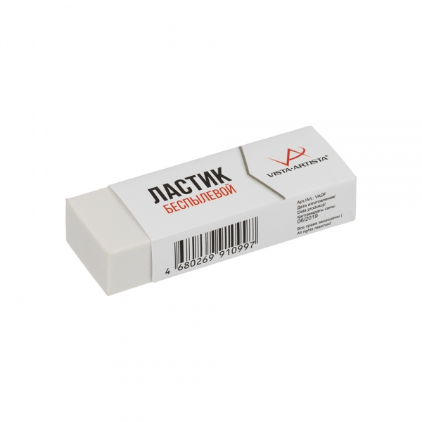 Ластик беспылевой ТМ VISTA-ARTISTA предназначен для стирания следов чернографитных карандашей с различных видов бумаг. Не оставляет пыльных следов и разводов, не истончает бумагу. Ластик упакован в чехол для предотвращения загрязнения. Состав: 100 % синтетический каучук [термопластичная резина].