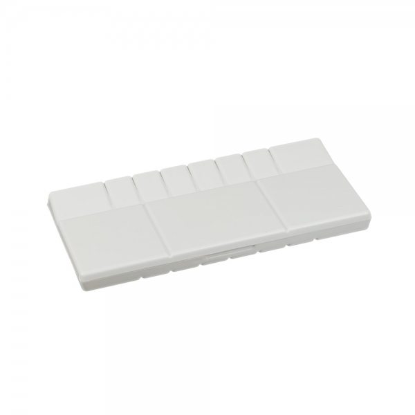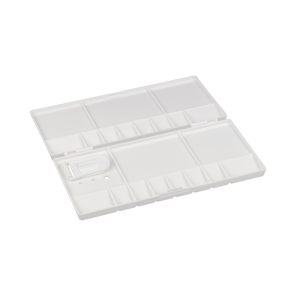 Прямоугольная пластиковая палитра с крышкой. 16 ячеек под краски и 5 больших отсеков для смешивания красок. Для удобства работы на пленэре у палитры имеется открывающийся захват для пальца, 5 отверстий для размещения кистей.
