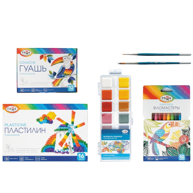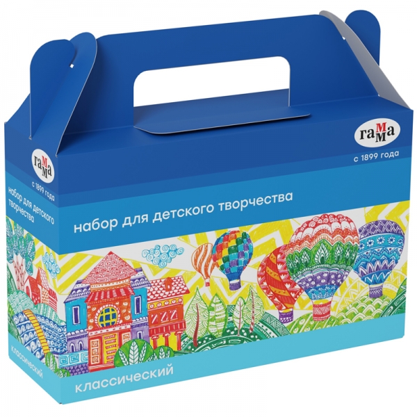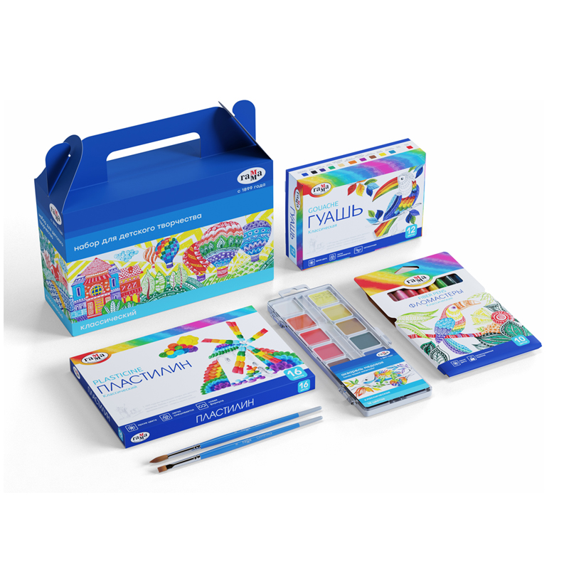 Набор для детского творчества в яркой коробке с ручкой и фирменным дизайном включает в себя 5 продуктов серии "Классическая". Состав набора: Акварель "Классическая", медовая, 14 цветов, Пластилин "КЛАССИЧЕСКИЙ", 16 цветов, Гуашь Классическая, 12цветов, Фломастеры "Классические", 10 цветов, Кисти.