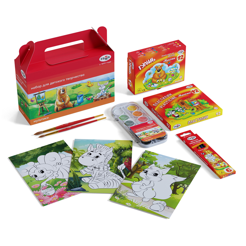 Набор для детского творчества в яркой коробке с ручкой и фирменным дизайном включает в себя 6 продуктов серии "Мультики". Состав набора: Акварель "Мультики", 12 цветов, Пластилин МУЛЬТИКИ, 12 цветов, Гуашь МУЛЬТИКИ, 12 цветов, Карандаши цветные "Мультики", трехгранные, 6 цветов, Кисти, Раскраски на картоне А5.