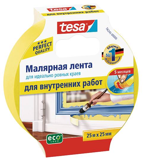 Малярная лента Tesa 56245 для четких краев и внутренних работ- это тонкая бумажная клейкая лента, которая может обеспечить ровные и четкие края окрашенных поверхностей. Лента сделана из акрилового клея, который не содержит растворителей. Часто применяется для декорирования интерьера- покраска дверей или окон. Удаляется легко и без лишних следов, даже спустя 5 месяцев после нанесения. Идеально подходит для применения на ровных и шероховатых поверхностях. Подходит для любых типов красок. Удобная в работе, минимум подтеков, эластичная, тонкая и в тоже время прочная лента. Можно использовать в местах попадания прямого солнечного света. Легко отрывается руками. Цвет ленты: насыщенный желтый.