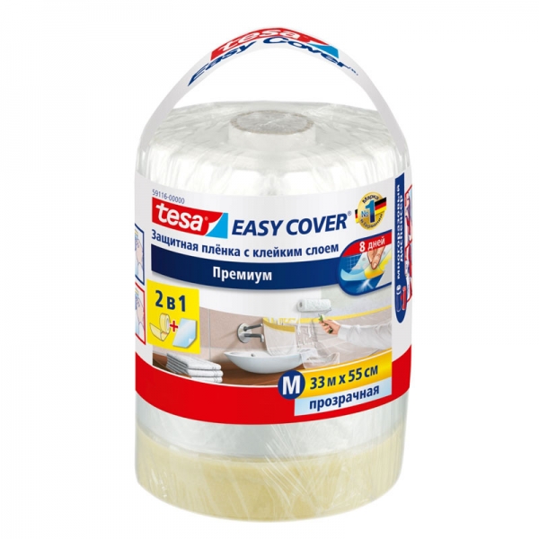 Укрывная плёнка с малярной лентой tesa Easy Cover®59116, 33м (Д) Х 0,55м (Ш). Сочетание самоклеящейся малярной ленты и полиэтиленовой плёнки, другое название "маскер". Экономит Ваше время! Для быстрой и простой защиты поверхностей и маскирования больших площадей при покрасочных и малярных работах. Лента обеспечивает надёжную фиксацию на ровных поверхностях, таких как: стены, плинтуса, подоконники, дверные проёмы, оконные рамы, полы.Малярная лента хорошо прилипает к поверхности, не допуская подтёков краски и в отличие о дешёвых аналогов, надёжно удерживает плёнку на поверхности. Электростатический заряд на поверхности плёнки обеспечивает плотное прилегание, что не позволяет плёнке отделяться от поверхности под воздействием потока воздуха или ветра. Рифлёная структура плёнки замедляет стекание краски.