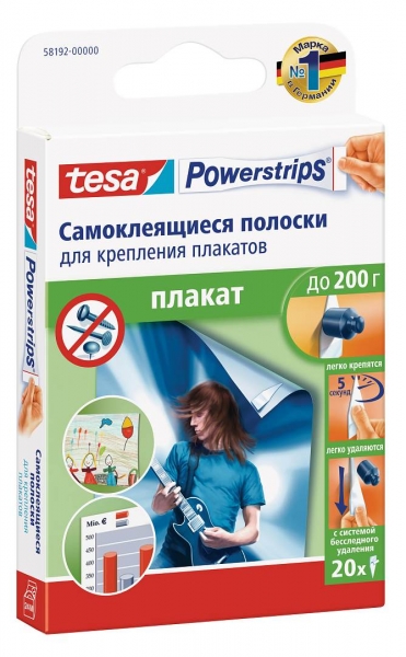 Полоски tesa Powerstrips – это двусторонние клейкие полоски для фиксации плакатов. Позволяют повесить плакат, не повреждая ни поверхность стены , ни сам плакат. Поскольку их в любое время можно снять, не оставляя видимых следов, они идеально подходят для того, чтобы повесить плакат, не повреждая поверхность; и работать с ними значительно удобнее, чем использовать обычные канцелярские кнопки. Используйте их для того, чтобы разместить в офисе карты и иллюстрации на длительное время или для временной экспозиции. Невидимая фиксация декоративных плакатов дома.