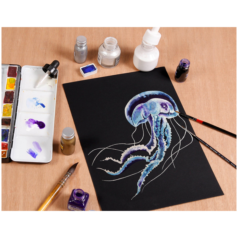 Чёрный лист прекрасно подходит для рисования прозрачным, переливающимся или металлическим оттенком, что придает красивую глубину и блеск иллюстрации.