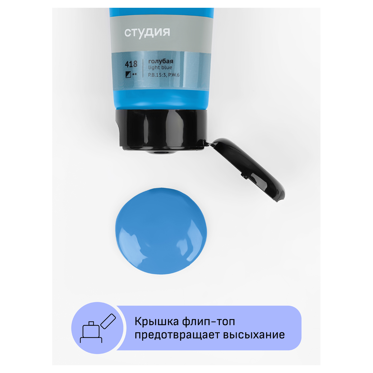 Новые акриловые краски "Студия" предназначены для художественно-живописных и декоративно-прикладных работ. Их отличают насыщенные цвета, высокая адгезия, отличная прочность. После высыхания становятся глянцевыми, практически не темнеют, специальные добавки позволяют максимально раскрыть красоту цвета. Акриловые краски "Студия" обладают густой консистенций, высокой разносимостью, позволяя писать в различных техниках живописи. Время высыхания от 10 минут до 1 часа в зависимости от толщины слоя краски. Подходят для бумаги, картона, грунтованного холста, дерева, стекла, кожи, ткани. Прозрачный корпус тубы позволяют увидеть цвет краски, а удобная крышка флип-топ предотвращает высыхание краски в тубе.