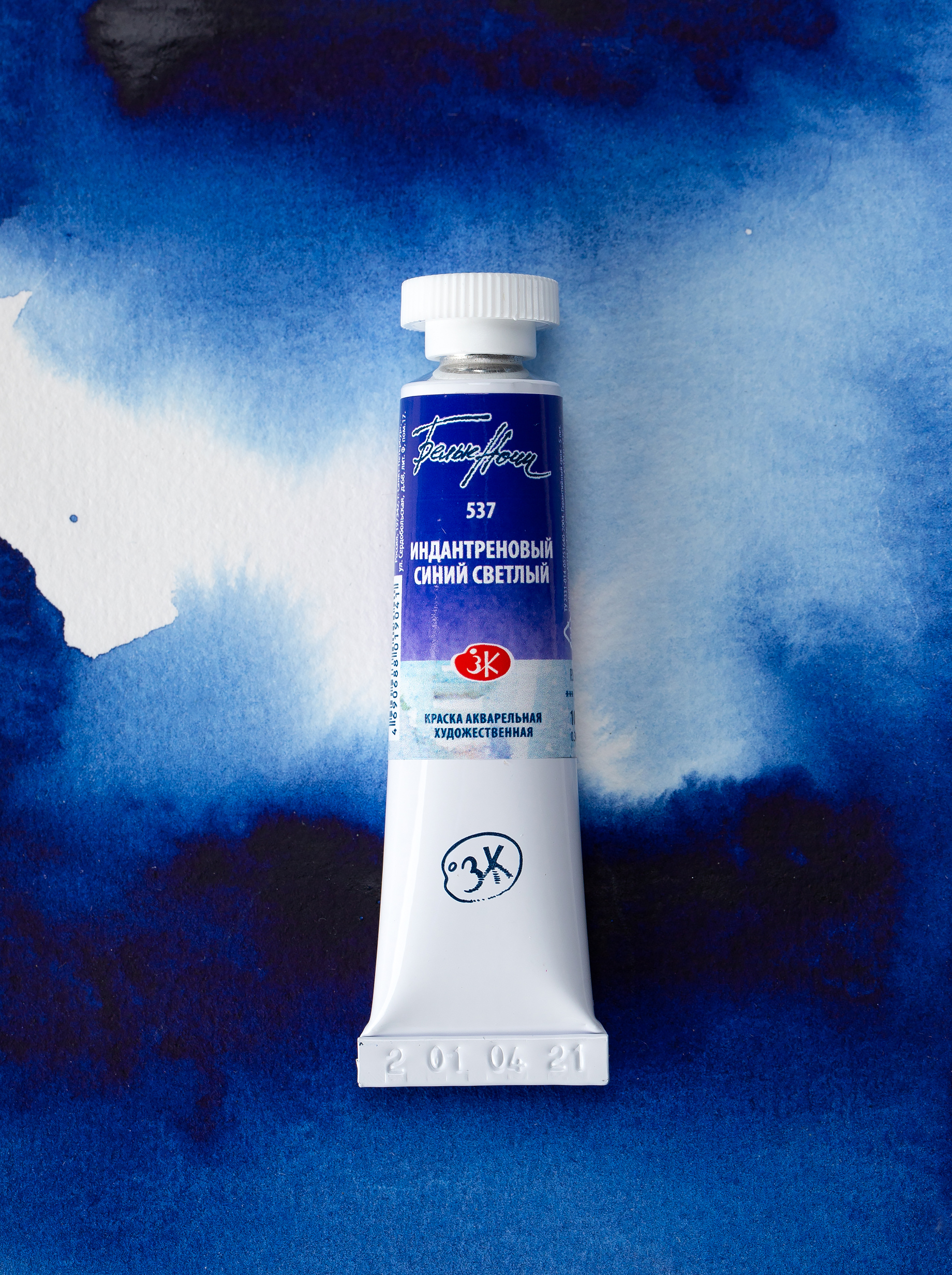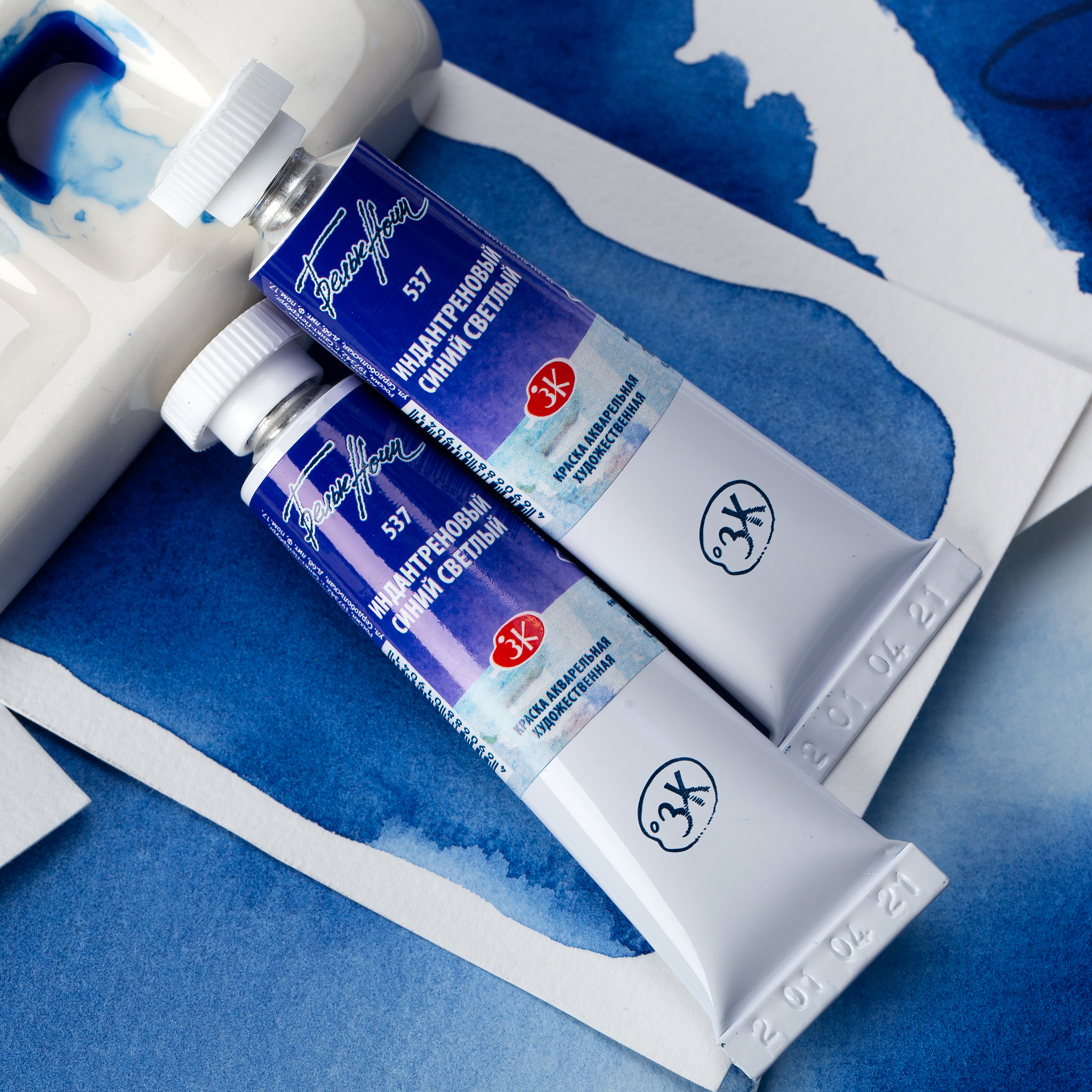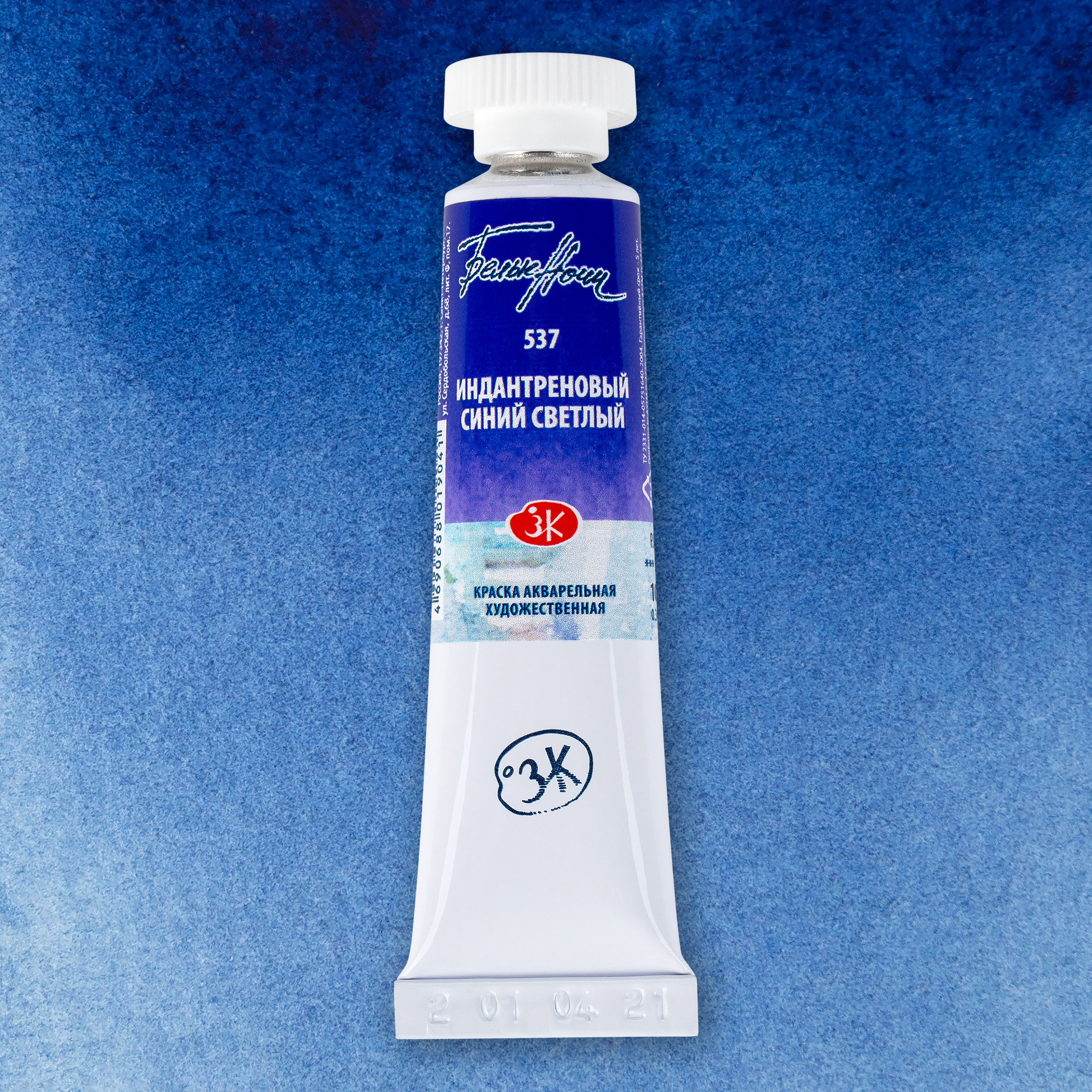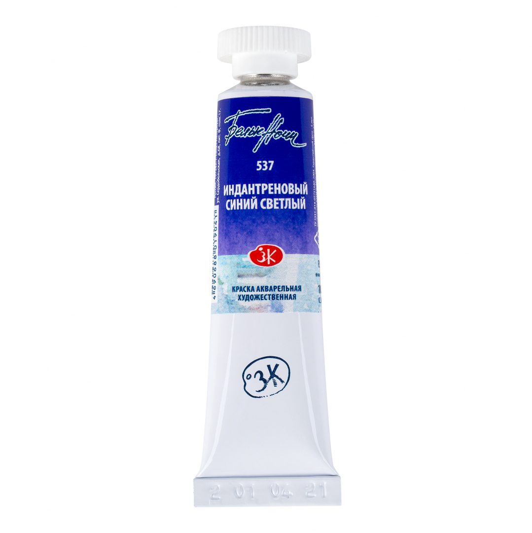 Рецептура нового цвета максимально приближена к выведенному из палитры Индатреновому синему (524). Индантреновый синий светлый относится к группе пигментов P.B. 60, как и Индантреновый синий, и обладает идентичными свойствами: краска прозрачная, среднеустойчивая к смыванию, с максимальной светостойкостью ***. Новый цвет обладает высокой красящей силой, но он менее тёмный и обладает тёплым оттенком.