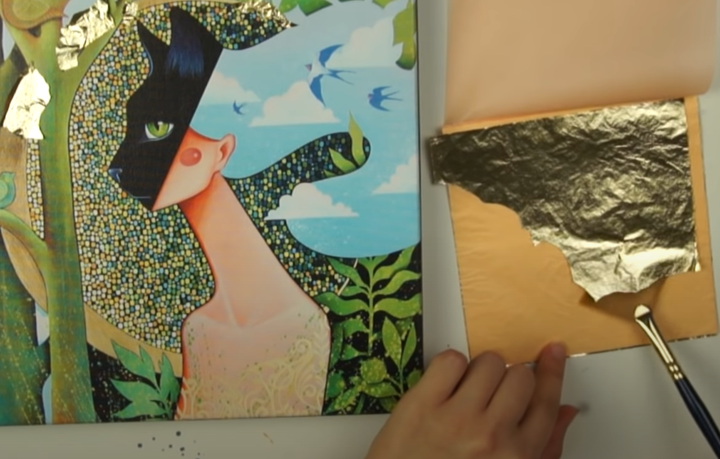 Приступать к нанесению потали на художественные работы следует убедившись, что красочный слой полностью высох, в противном случает тонкие нежные листы потали прилипнут на невысохшие участки. Кроме того, важно избегать любого контакта с водой при работе.