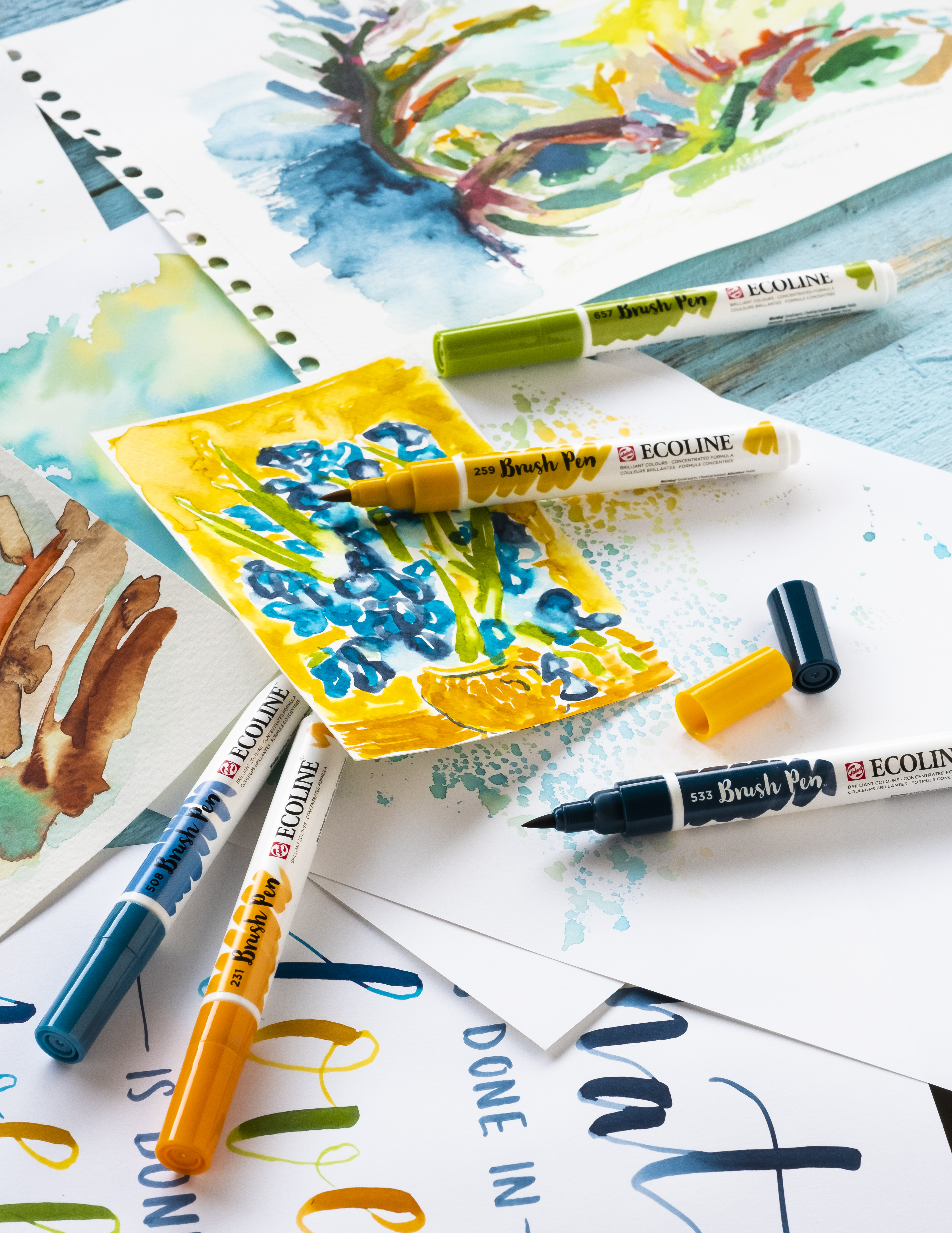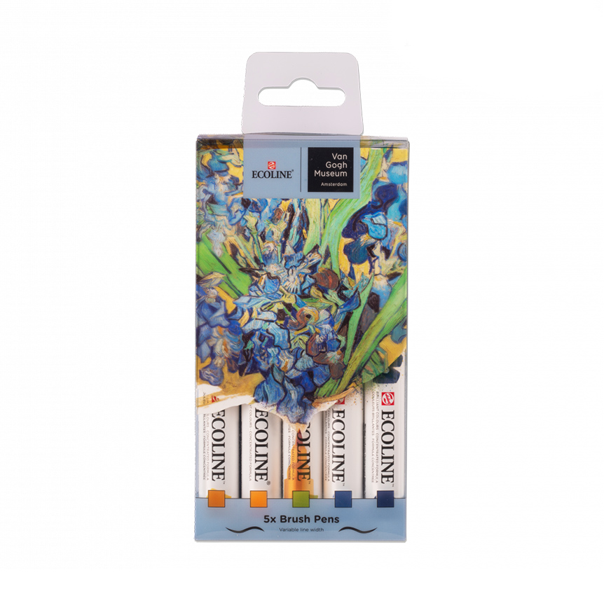 Набор из пяти брашпенов Ecoline идеально подходит для иллюстрации и леттеринга. Цвета набора сочетаются с яркой палитрой знаменитых «Ирисов» Ван Гога – в этой работе художник экспериментировал с мощными цветовыми контрастами, выделяя фиолетовые цветы на желтом фоне.¶Цвета в наборе: 259 Sand Yellow, 231 Gold Ochre, 657 Bronze Green, 508 Prussian Blue,533 Indigo.