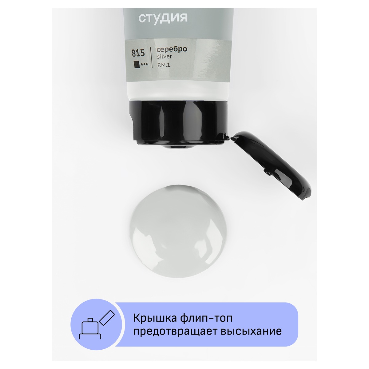 Прозрачный корпус тубы позволяет увидеть цвет краски, а удобная крышка флип-топ предотвращает высыхание.