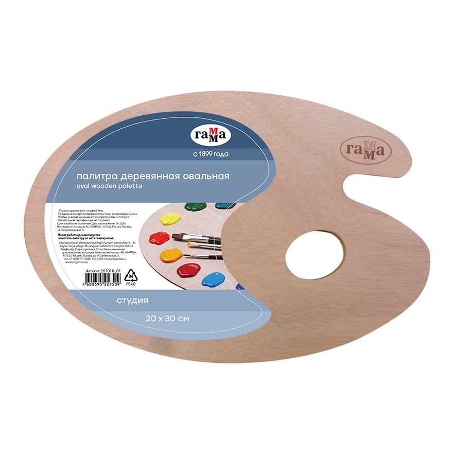 Лёгкая и прочная деревянная палитра с гладкой поверхностью. Подходит для смешивания масляных, акриловых и темперных красок, устойчива к разбавителям и растворителям.