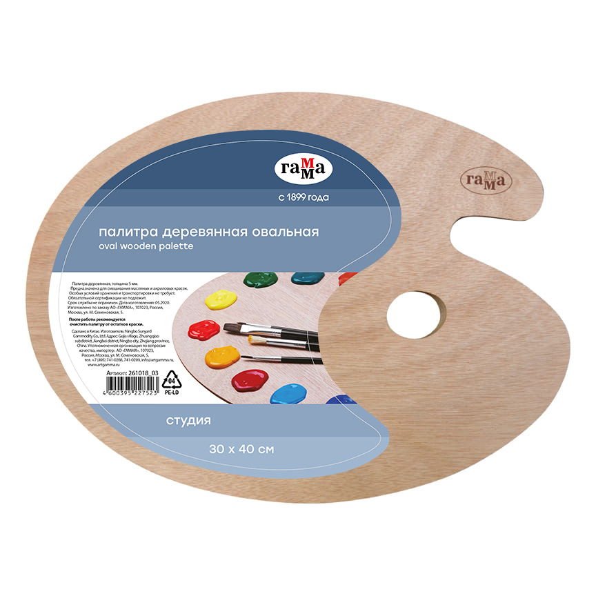 Лёгкая и прочная деревянная палитра с гладкой поверхностью. Подходит для смешивания масляных, акриловых и темперных красок, устойчива к разбавителям и растворителям.