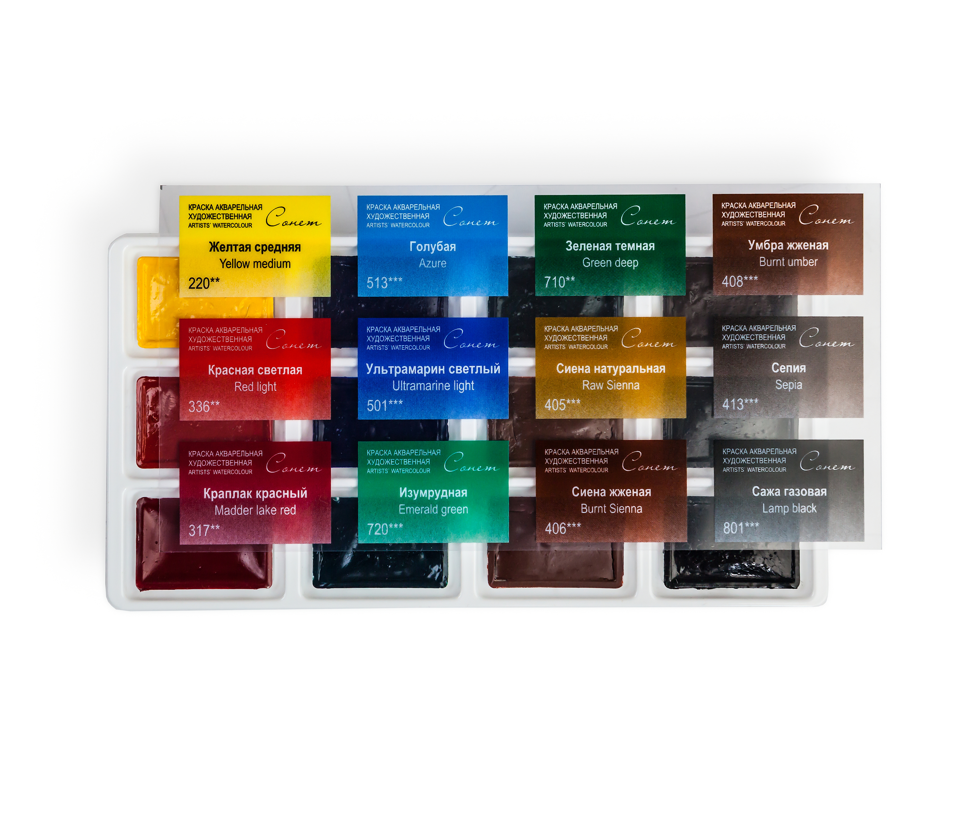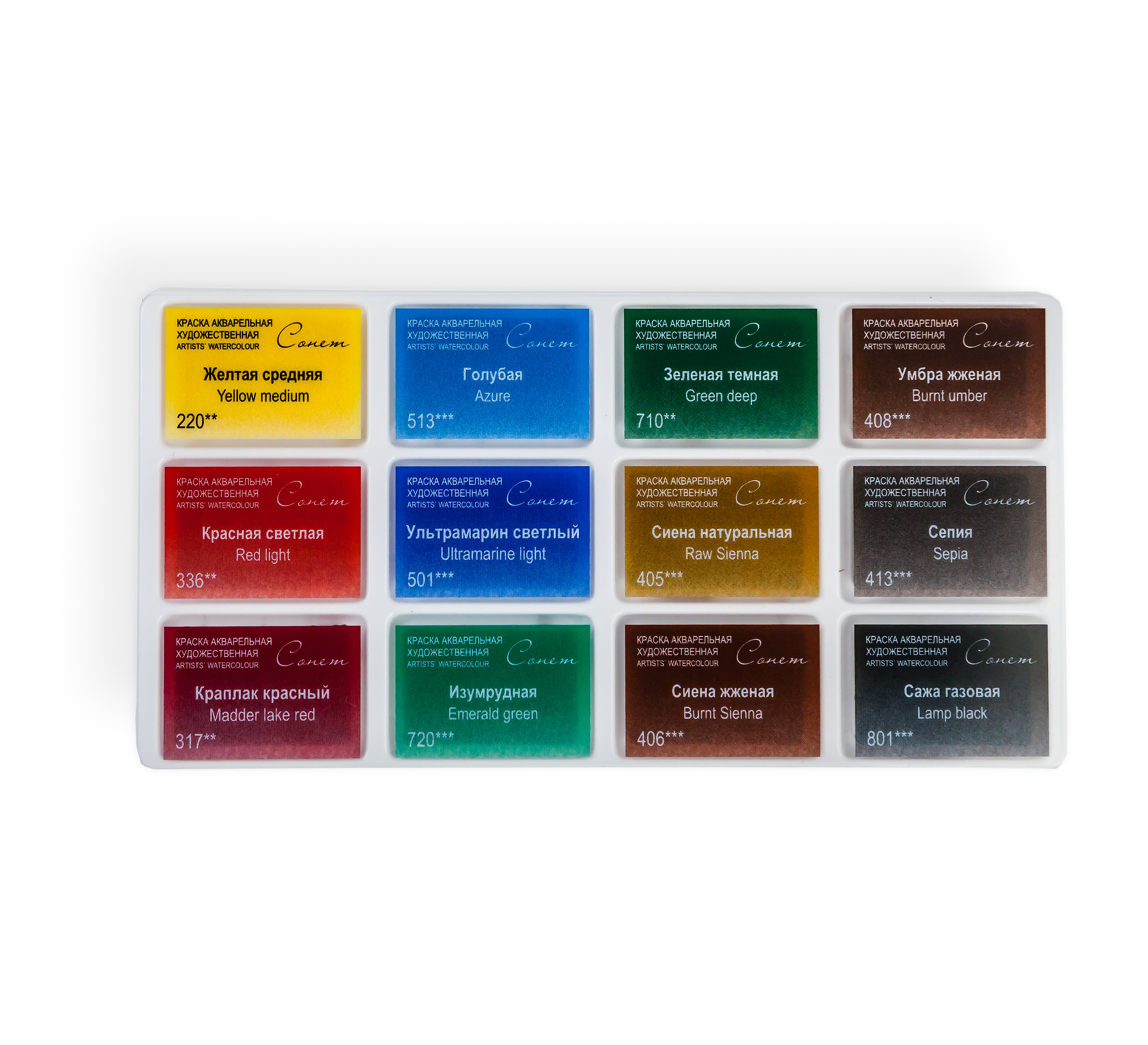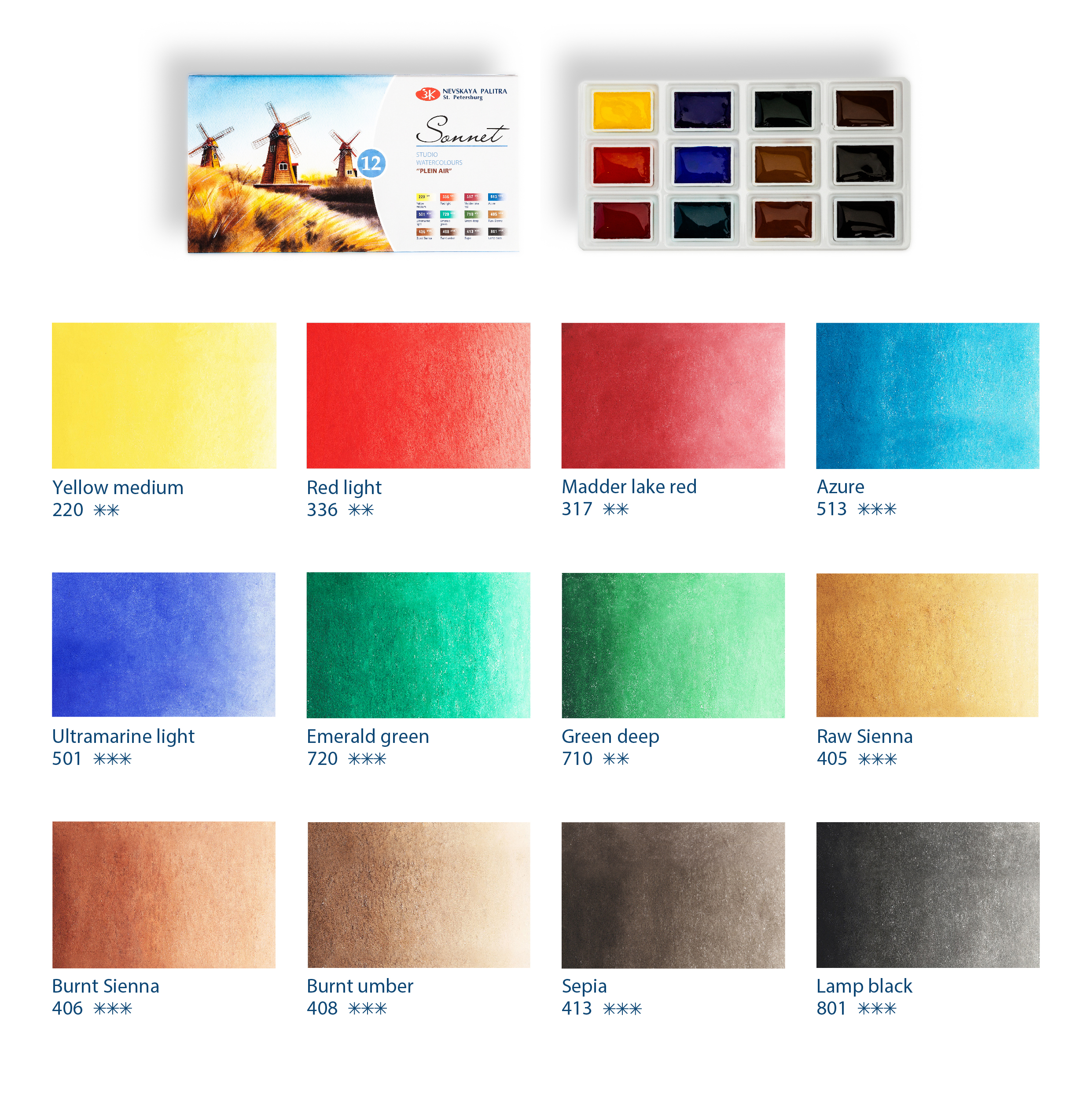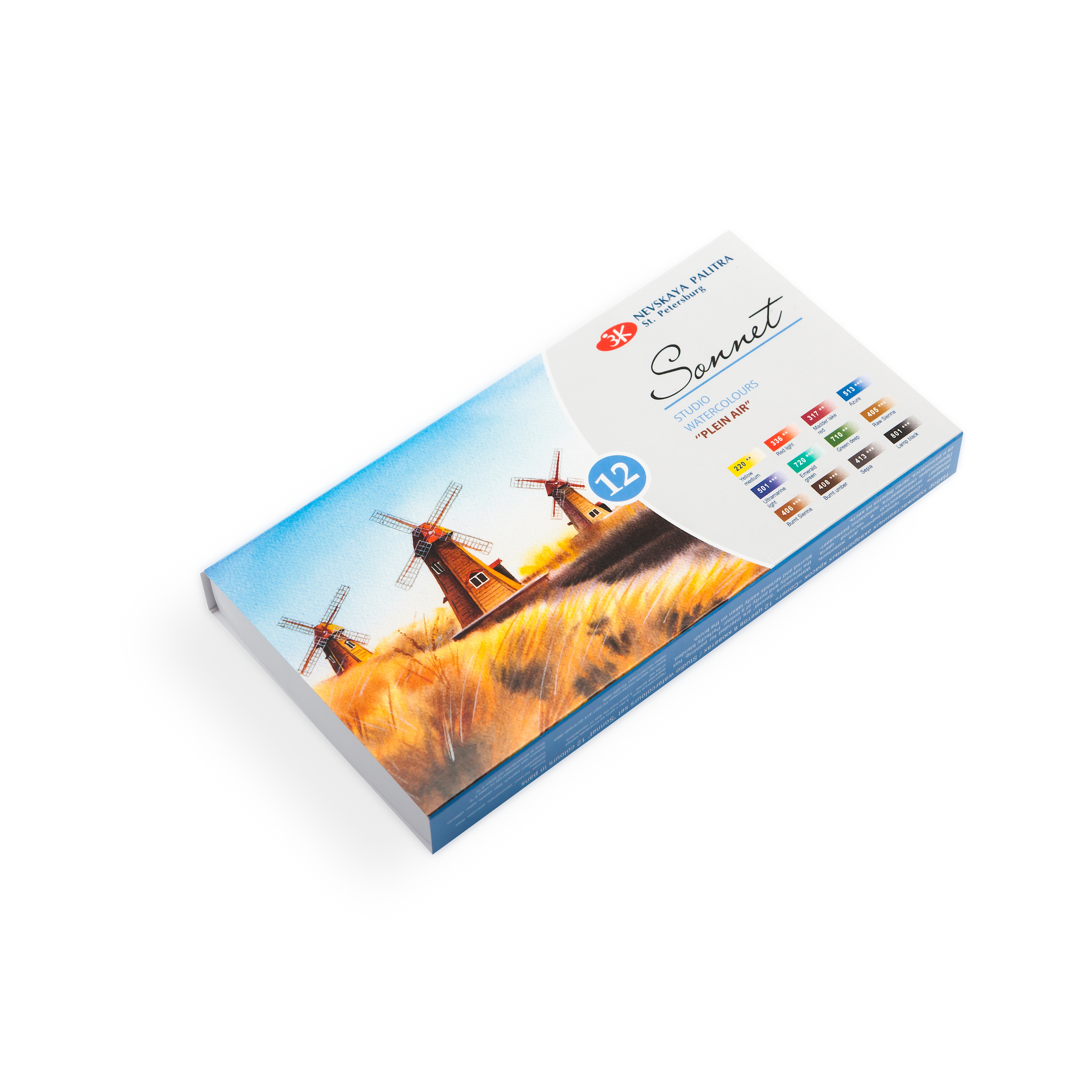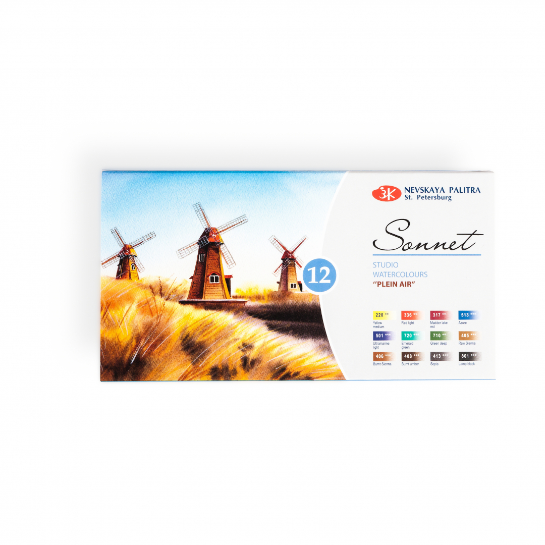 Художественные акварельные краски «Сонет» разработаны для начинающих художников, открывающих или совершенствующих свои творческие способности. Изготавливаются по современным рецептурам на основе преимущественно органических пигментов и синтетического связующего. Обладают интенсивностью цвета и прозрачностью. Превосходно смешиваются, размываются и легко берутся на кисть. Палитра набора акварели «Сонет» Пленэр состоит из специально подобранных 12 цветов акварели для написания пленэрных работ начинающими художниками.