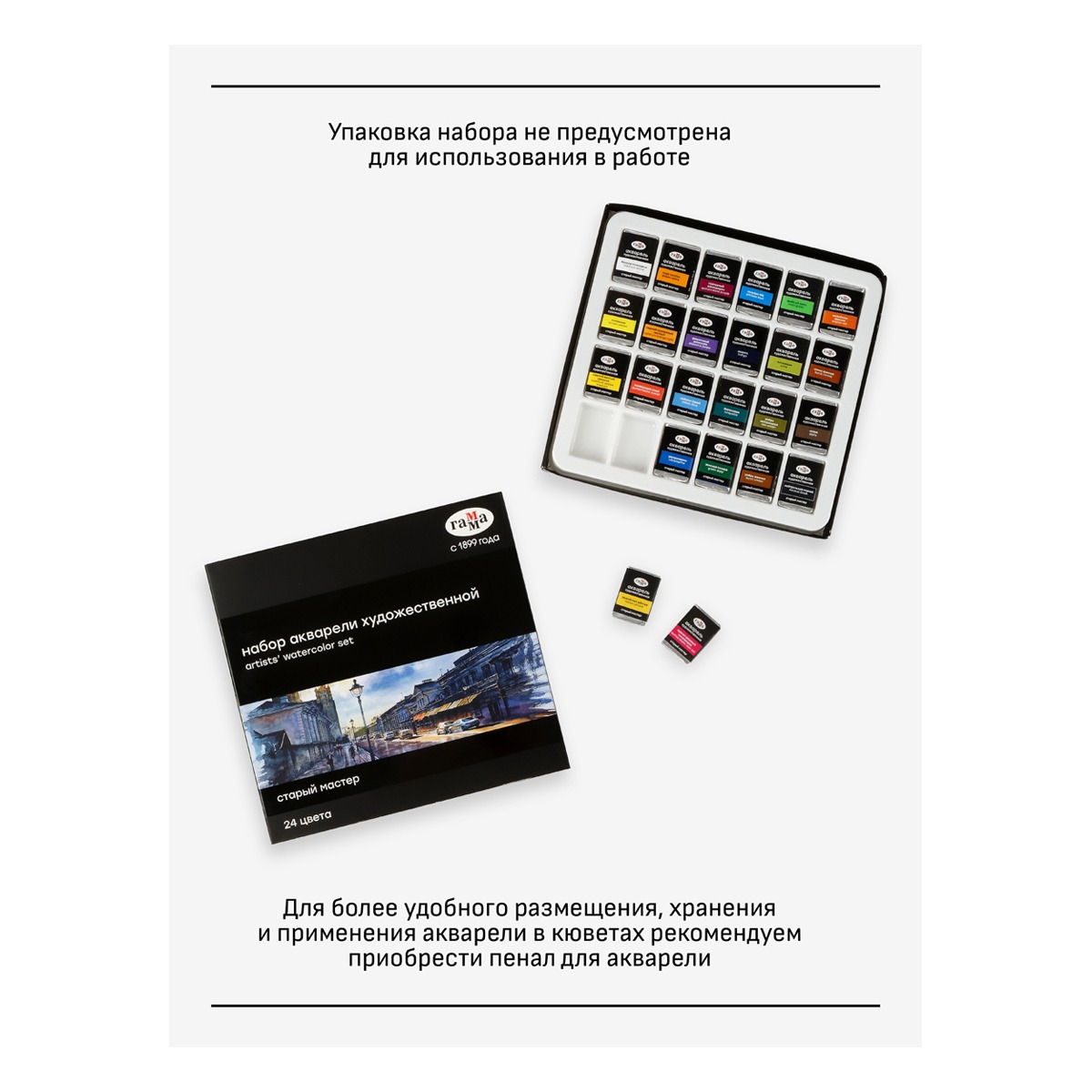 Кюветы в наборах «утончённые», однако, в поштучном сегменте в продаже уже замечены цвета в «новых» кюветах стандартного размера. Данный факт позволяет надеяться, что Гамма нивелируют главную претензию к упаковке своей продукции и, тем самым, решит проблему эксплуатации своей краски. Художники смогут интегрировать Старый мастер в имеющиеся палитры. Прекрасное и оправданное решение!