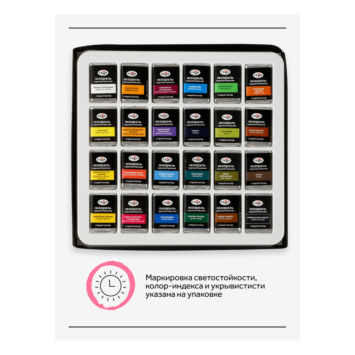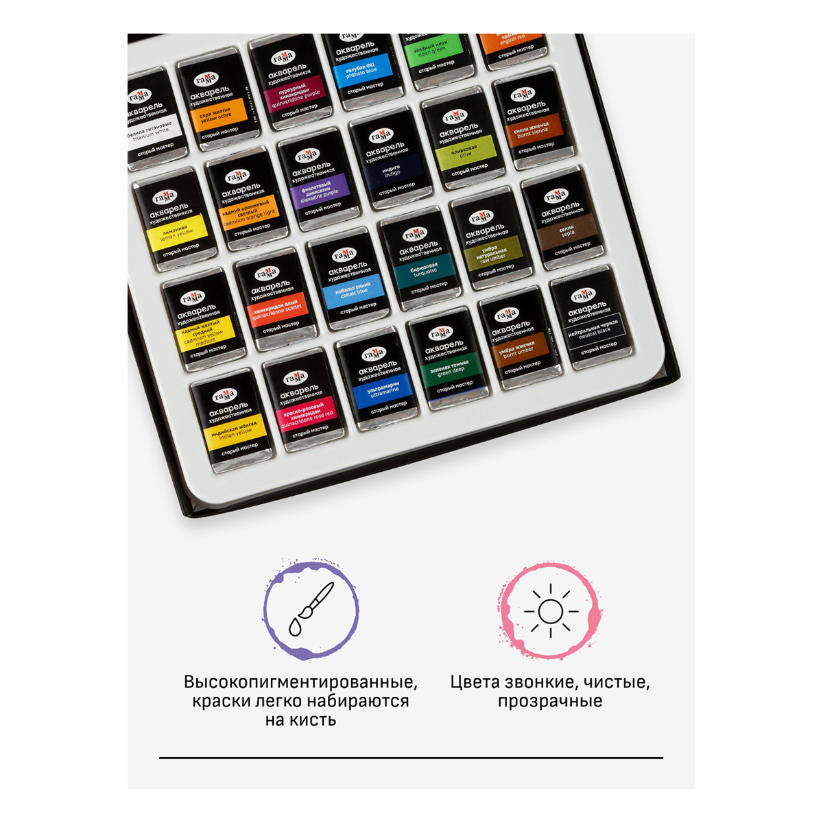 Серия «Старый мастер» на данный момент является флагманской линейкой акварели от Гаммы, поэтому носит название профессиональной серии.