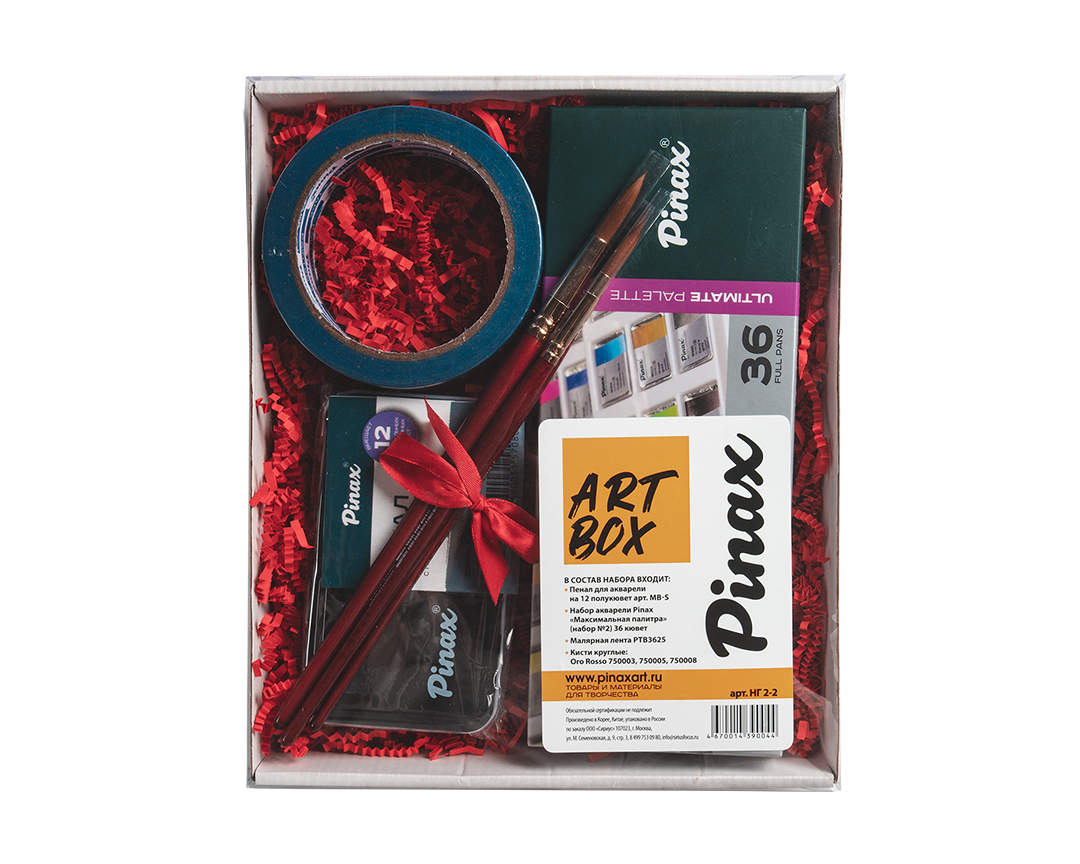 Подарочный набор №2 включает в себя: набор акварели Artists из 36 цветов №2, металлический пенал на 12 кювет, три кисти из мягкой синтетики Oro Rosso и специальную малярную ленту для бумаги.