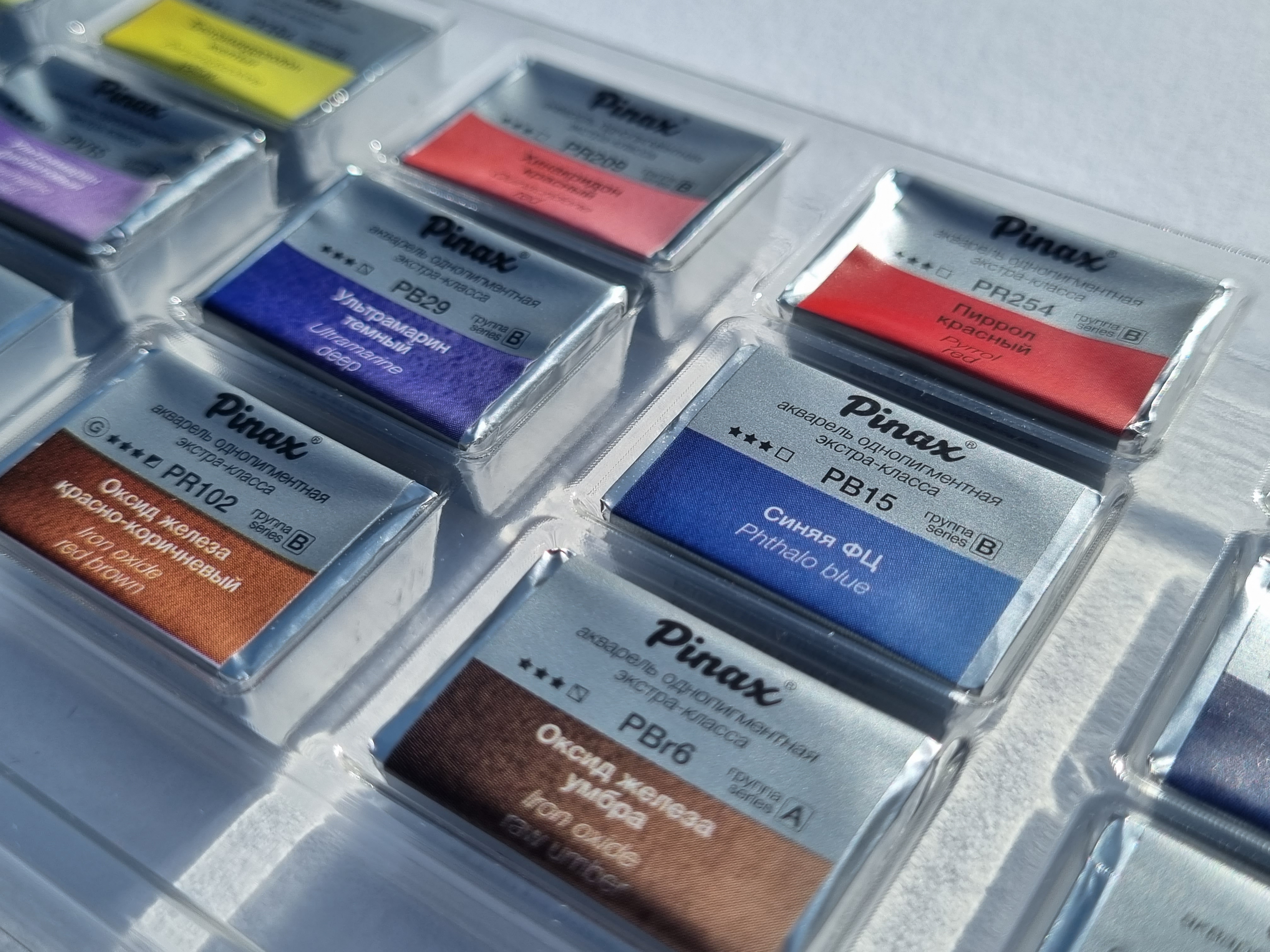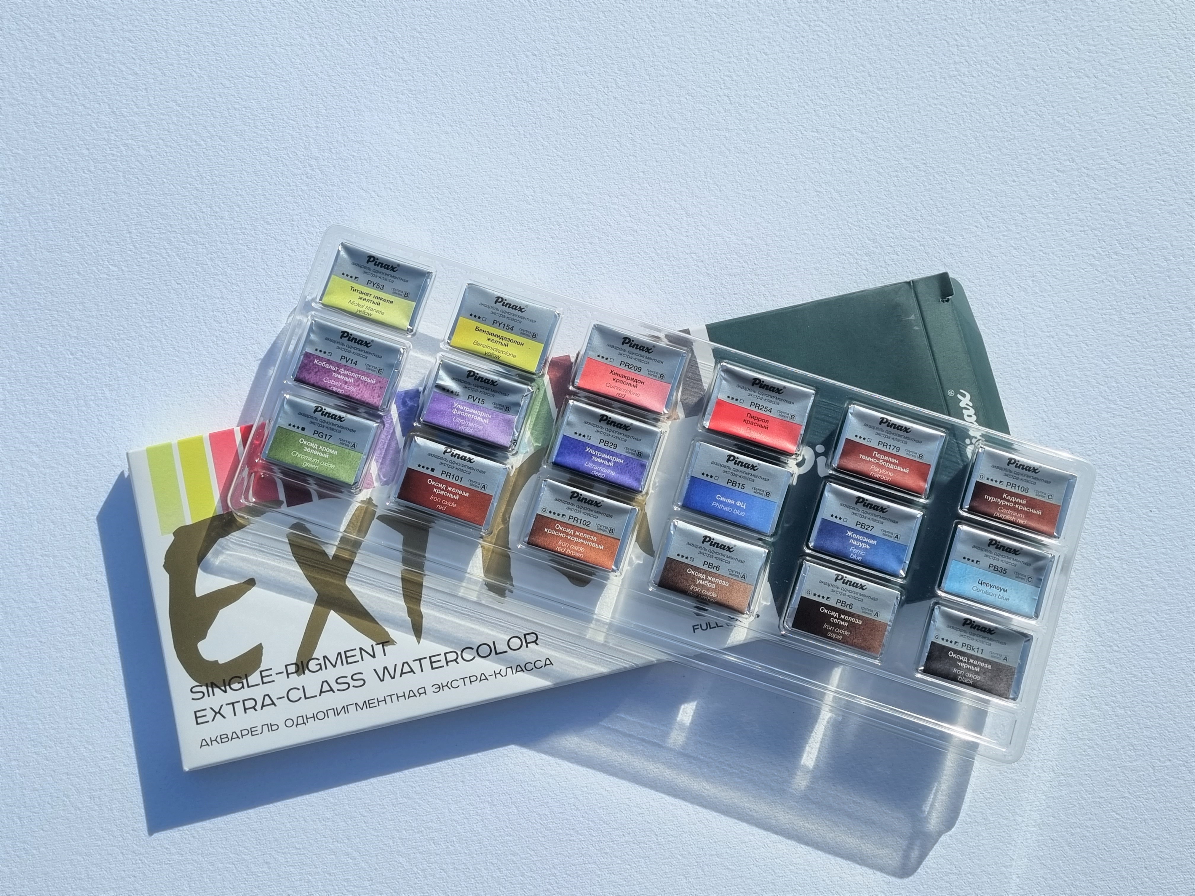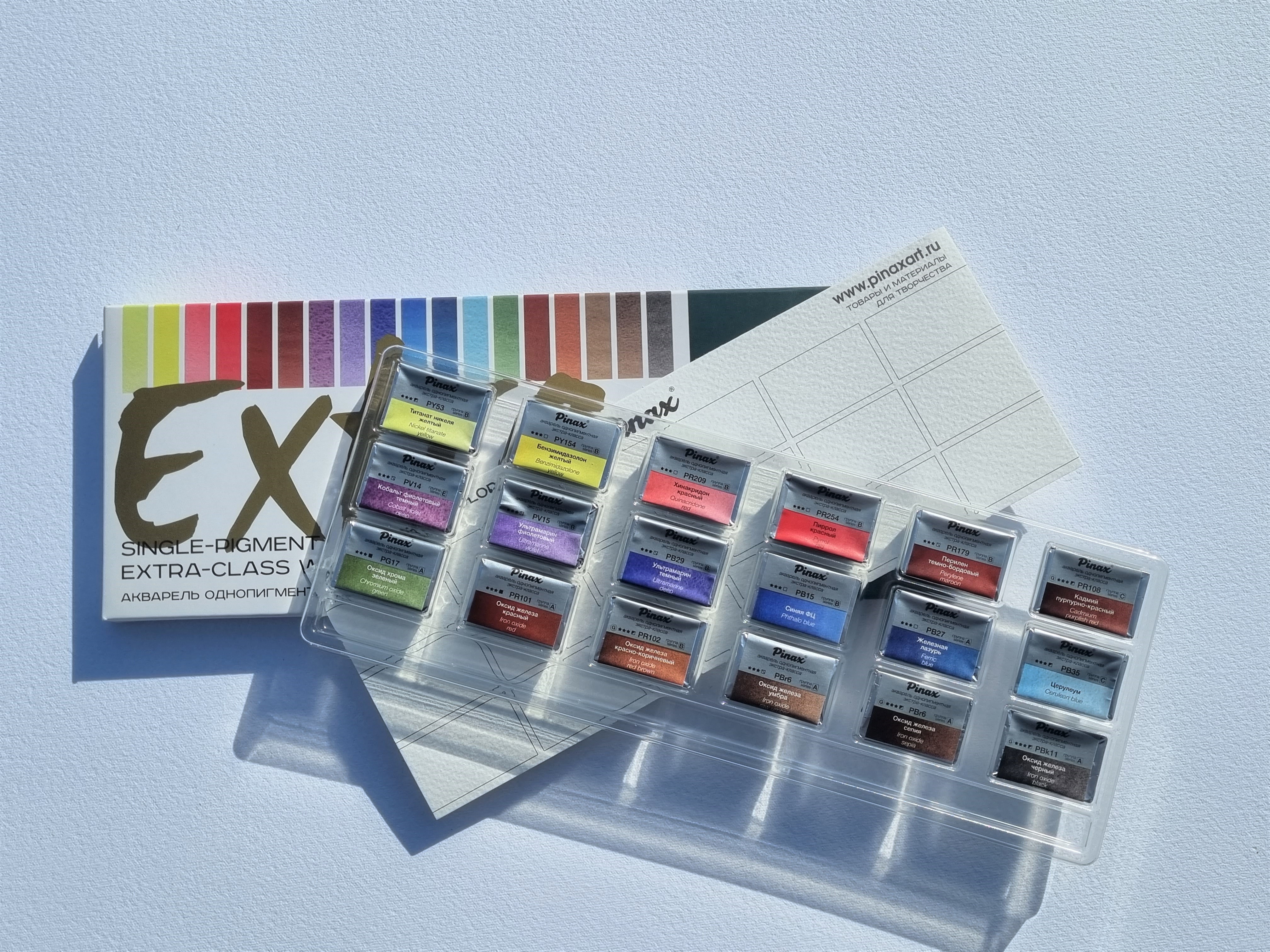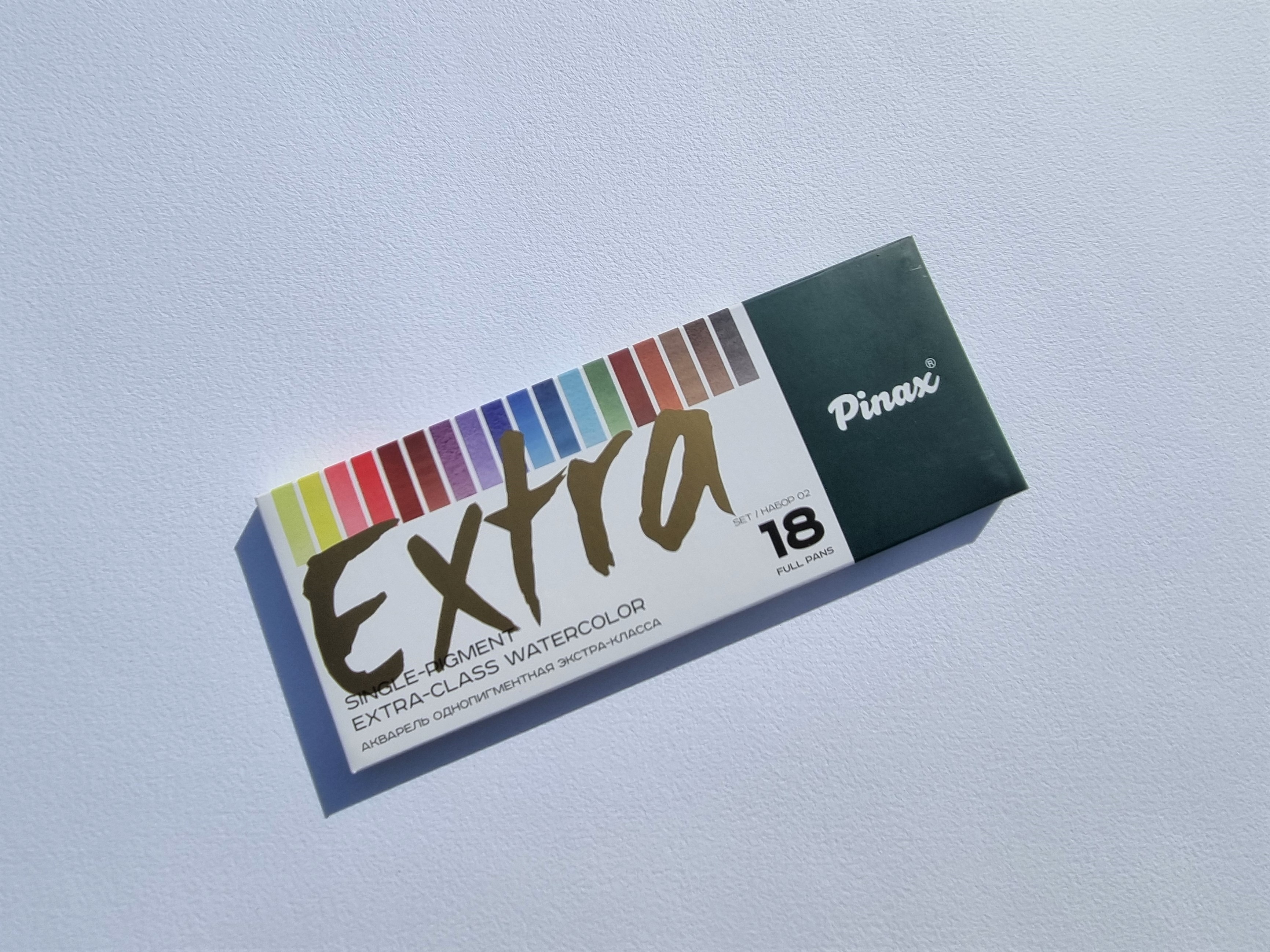Набор №2 состоит из новых цветов Extra. Новая серия акварельных красок от Pinax «Extra» производится с использованием только одного пигмента. Краски «Extra» производятся в России.