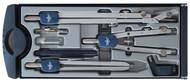 Комплектация: универсальный циркуль, измерительный циркуль, малый кронциркуль с поворотным чертежным узлом, удлинитель, рейсфедер, держатель рейсфедера, упаковка стержней и запасная иголка