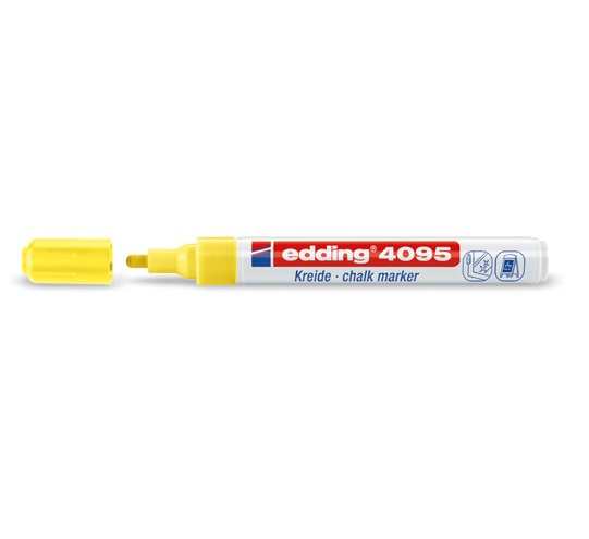 Корпус маркера изготовлен из прочного пластика. Маркер Edding-4095 имеет устойчивый, износостойкий (пулевидный) наконечник. Универсальный маркер на меловой основе предназначен для нанесения информации на любую гладкую поверхность – на стекло, кафель, керамику, пластик. Также возможно использование мелового маркера на деликатных пленчатых поверхностях, меловых досках, а так же на ряде шероховатых поверхностей. С любой гладкой поверхности хорошо стирается сухой губкой, с шероховатой поверхности удаляется водой. Чернила на основе разведенного мела не имеют запаха, не токсичны содержат высокую концентрацию меловых частиц, что позволяет им хорошо ложиться на гладкие и шероховатые поверхности, оставляя густую, плотную линию даже на темных поверхностях. Многие столичные супермаркеты и гипермаркеты уже используют наш маркер для нанесения информации на пластиковые или картонные ценники в торговых залах. Достоинство новых информационных табличек очевидно – надпись можно легко нанести и обновить, она яркая и заметная, а значит, привлекает взгляд. Теперь с помощью маркера Edding - 4095 возможно легко создать свой неповторимый фирменный стиль