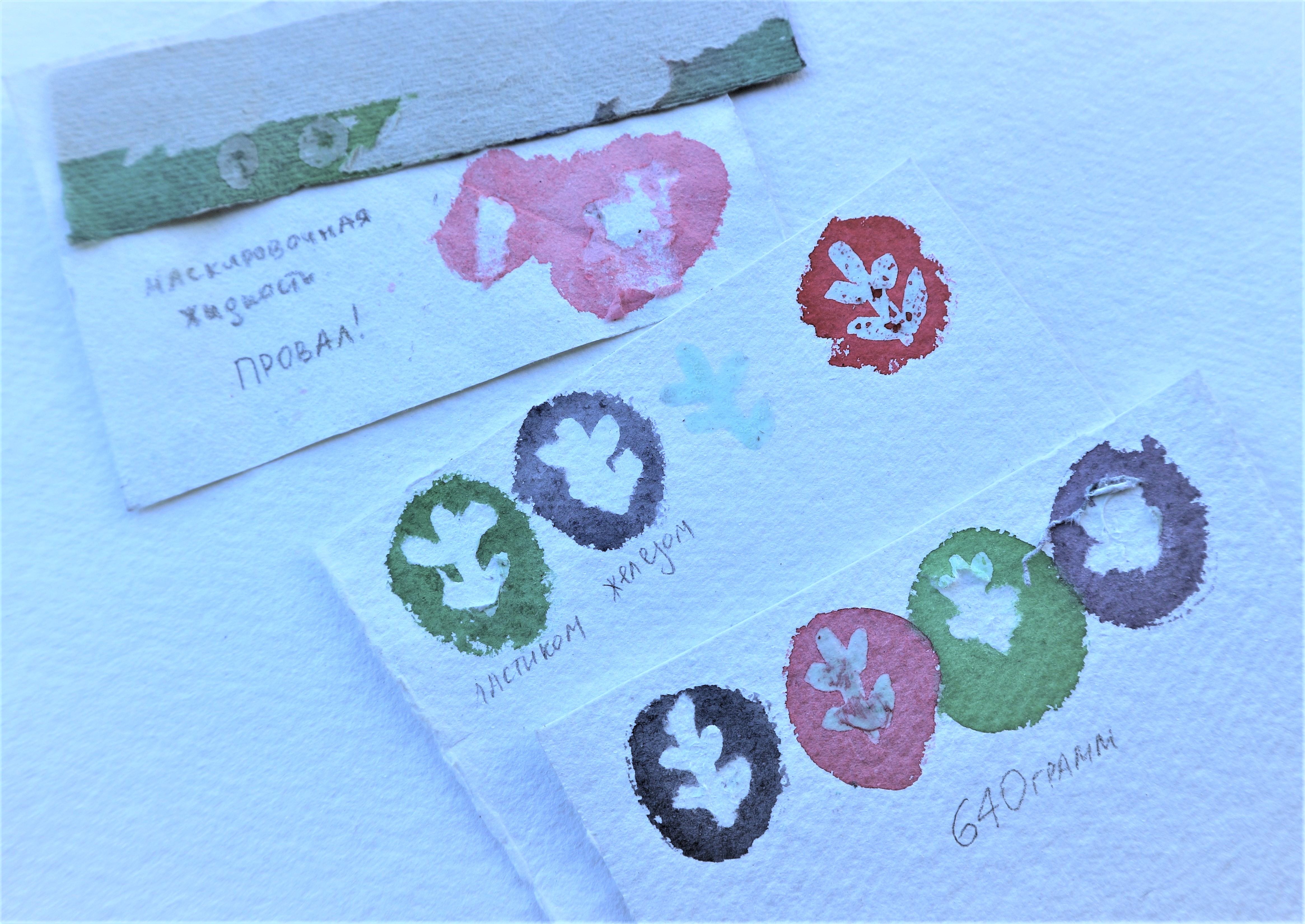 Полностью высохшая краска «поднимается» c некоторым усилием. Краска сильно въедается в эту бумагу. Однако, поверхность, даже после многочисленных механических воздействий, совершенно не портится. Край вымываемой области, более аккуратный, чем при снятии свежего пигмента, но не такой чёткий как на бумаге в 320г.