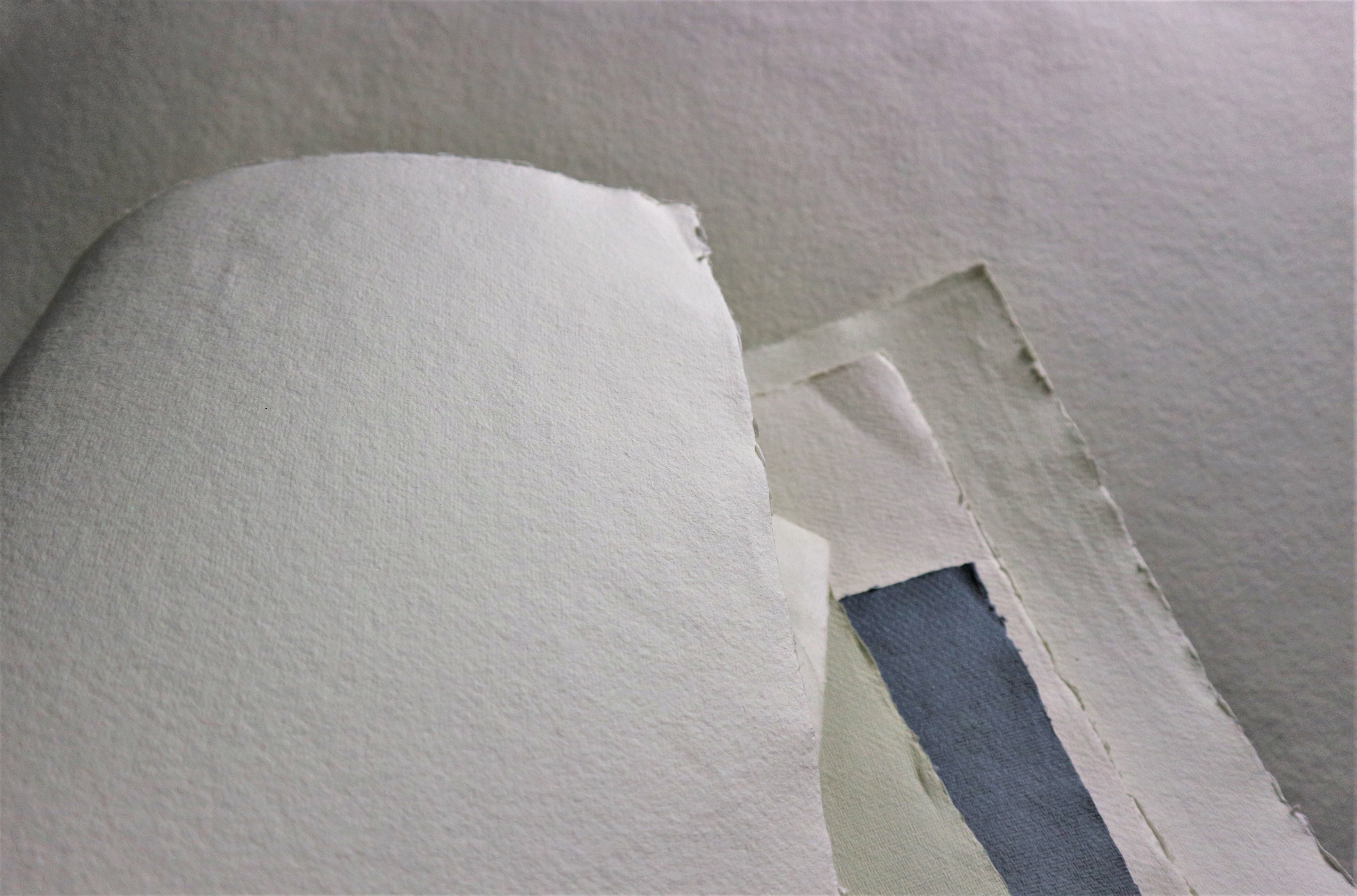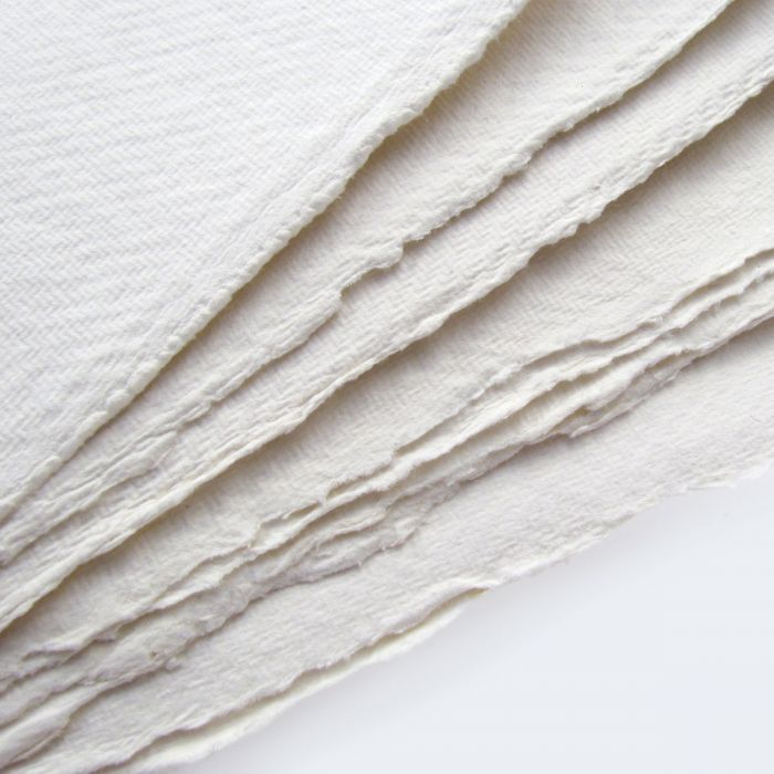 Бумага характерна своей неоднородностью. Она больше напоминает ткань, чем бумагу. Местами среди выраженной фактуры встречаются небольшие гладкие участки, а на просвет видны более плотные участки бумаги.