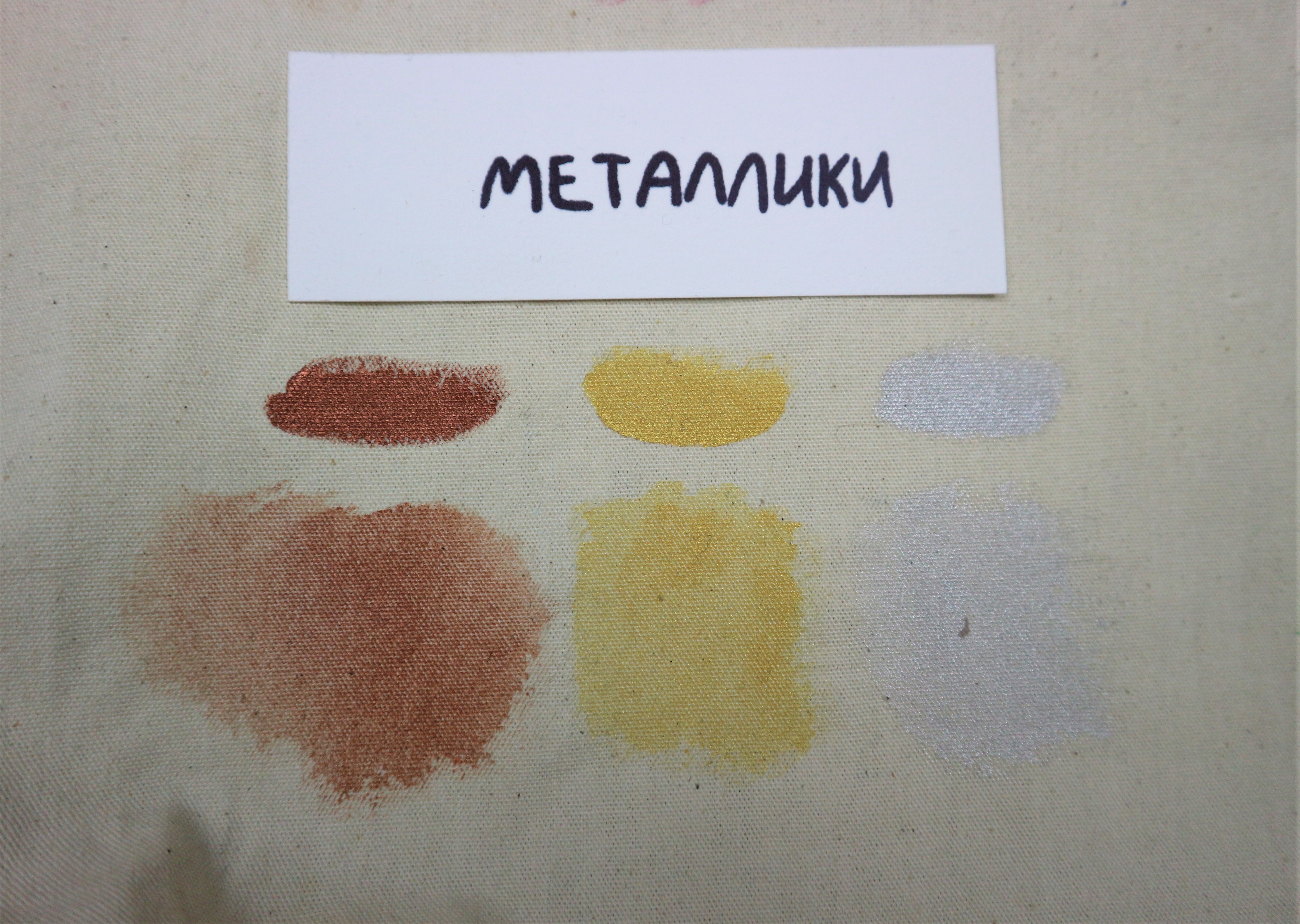 У металликов в серии очевидно бОльшая кроющая способность, чем у базовых оттенков. Например медь гораздо плотнее с первого же мазка, чем розовая, голубая или белая (см изо).